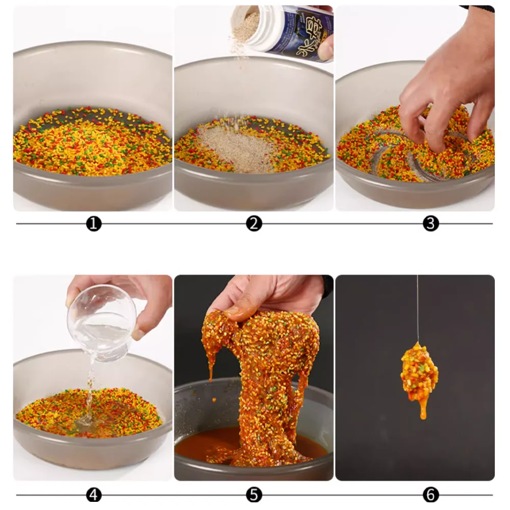 Kan alleen worden gebruikt; voeg water toe als het te droog is, knijp overtollig water eruit als het te nat is.Kan worden gebruikt met verschillende commercieel aas, met toevoeging van 5% - 15% voor een snelle bereiding van aas zonder smaakconflicten.