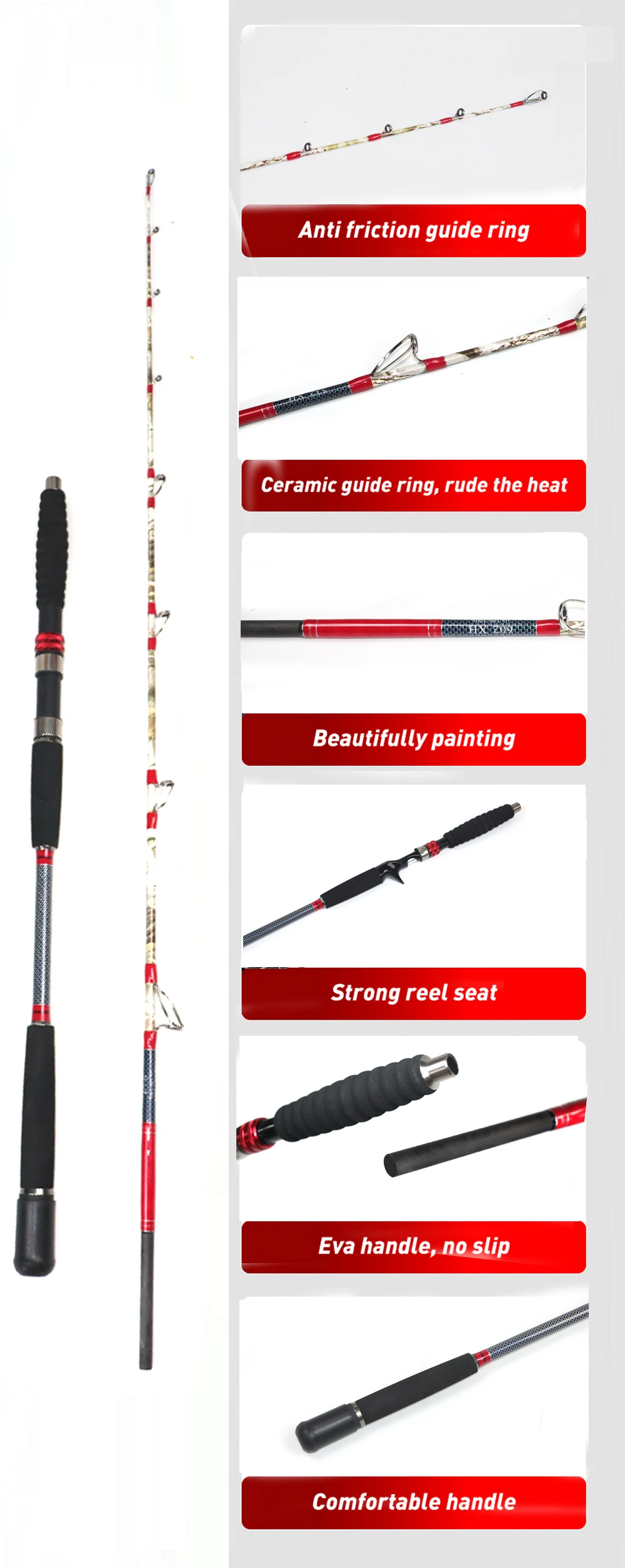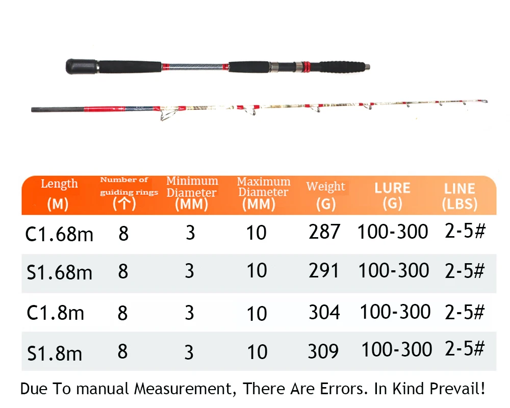 Longitud: 1,68 M 1,8 mPeso del señuelo: 100-300gPeso de Línea: 2-5 #