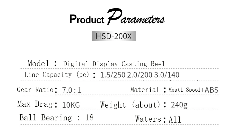 Información del producto: Relación de transmisión: 7,0: 1 Potencia de arrastre: 10kg Sistema de frenos: sistema magnético Capacidad de la línea: 1,5/250 2,0/200 3,0/140 Carrete: carrete de Metal + ABS Peso: 240g