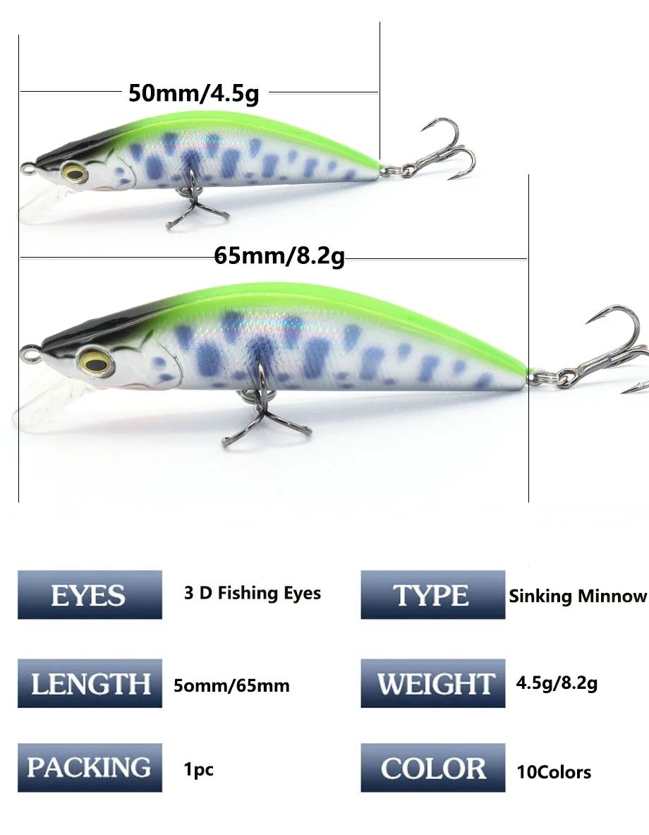 VOLIN nuevo 1 ud. Pececillo que se hunde 50mm 4,5g señuelo de pesca 65mm 8,2g Micro cebo duro Longcast Wobblers para trucha lubina Lucio