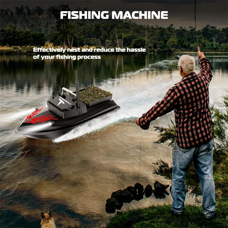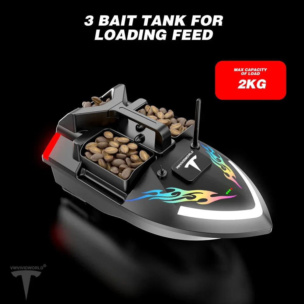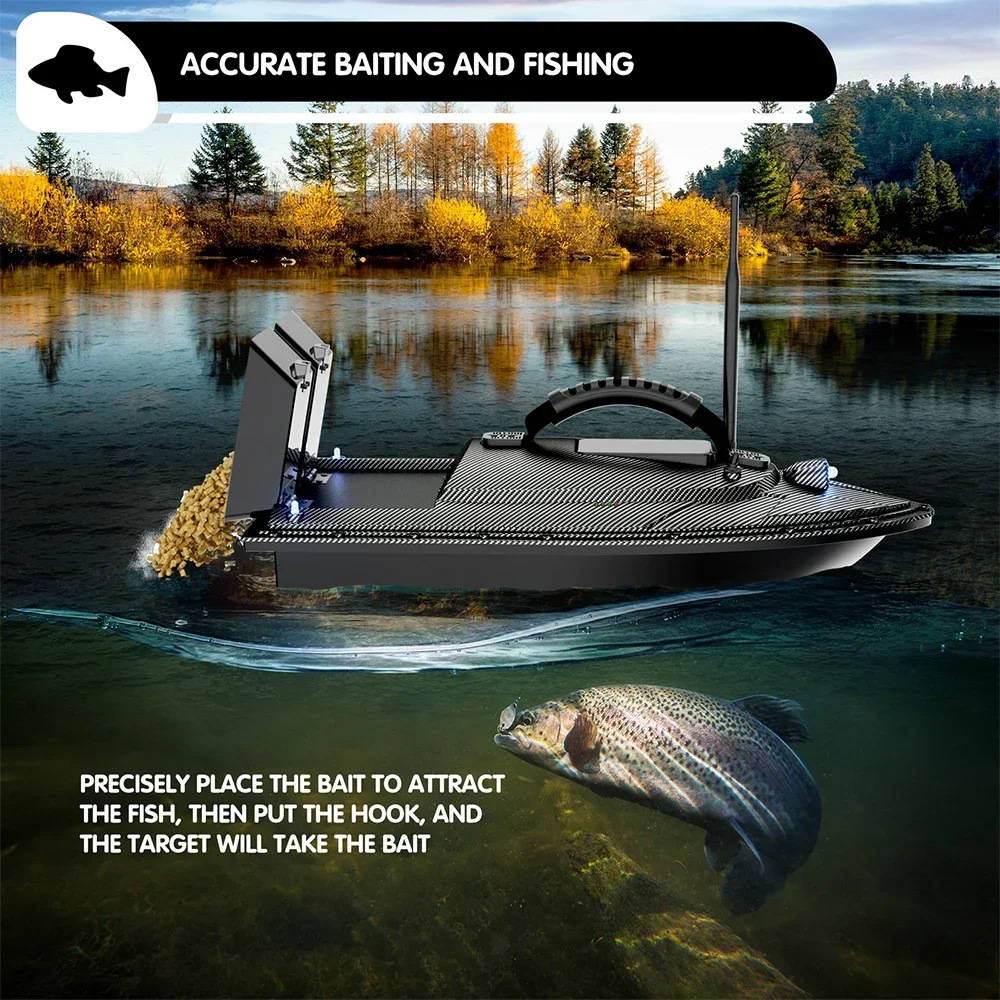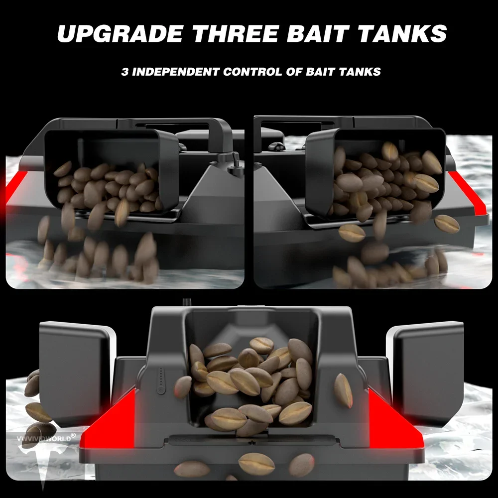 Adopta el diseño de tres tanques de cebo controlados de forma independiente, la capacidad de carga es de aproximadamente 2 kg, puede controlar el cebado de Punto Fijo, agregar diseño antidesacoplamiento en el silo trasero, puede enviar el anzuelo y el sedal, evitar que el sedal se enrede