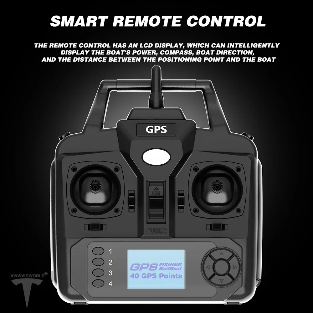 El control remoto tiene una pantalla LCD que puede mostrar de forma inteligente la potencia del barco, la brújula, la dirección del barco y la distancia entre el punto de posicionamiento y el barco.