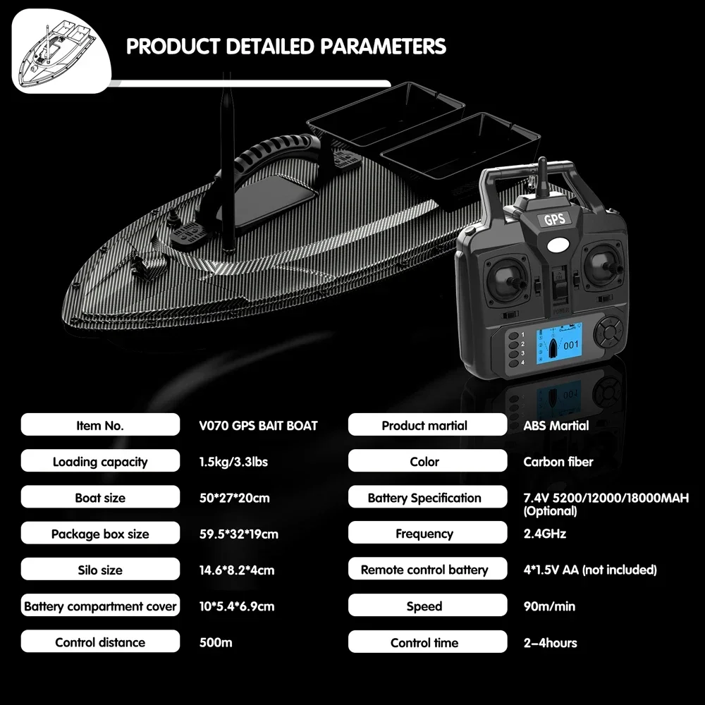 Descripción del producto Características: lanzamiento de cebo/crucero de velocidad fija/luz LED de pesca nocturna/indicador de luz de giro/indicador de batería baja/indicador de señal baja/ajuste fino de velocidad/posicionamiento GPS/visualización de distancia/40 puntos de posicionamiento/crucero automático retorno de batería baja/Retorno de contacto perdido/Carga de 1,5 kg Especificaciones: color: Patrón de carbono Material: ABS Max. Carga: 1,5 KG Capacidad de la batería del barco: mAh 5200/12000mAh (opcional) Batería de control remoto: 4 pilas AA (no incluidas) Tiempo de carga: 6 horas Tiempo de trabajo: 2 horas/4 horas máx. Velocidad: 10 km/h Rangos de control remoto: 500 metros Tamaño del barco: 550*270*170mm/21,6*10,6*6.7in Tamaño del paquete: 535*320 * 260mm/21,1*12,6 * 10.2in Peso del paquete: 2870g/ 6.3lb Lista de embalaje: 1 * Barco de cebo de pesca 1 * Control remoto 1 * Cable USB 1 * batería de barco 2 * varilla de Control remoto 1 * tornillo 2 * hélice 1 * ManualNota: Turquía y Francia tienen restricciones en el transporte de productos individuales superiores a 150 euros. Si el precio del pedido supera los 150 euros, póngase en contacto con el Servicio de Atención al Cliente para proporcionar un nuevo enlace. Gracias.