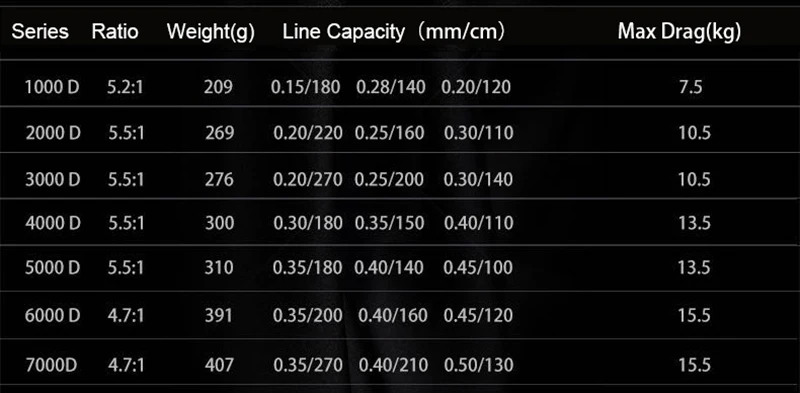 Serie/relación/peso/capacidad de línea/arrastre máximo (kg)