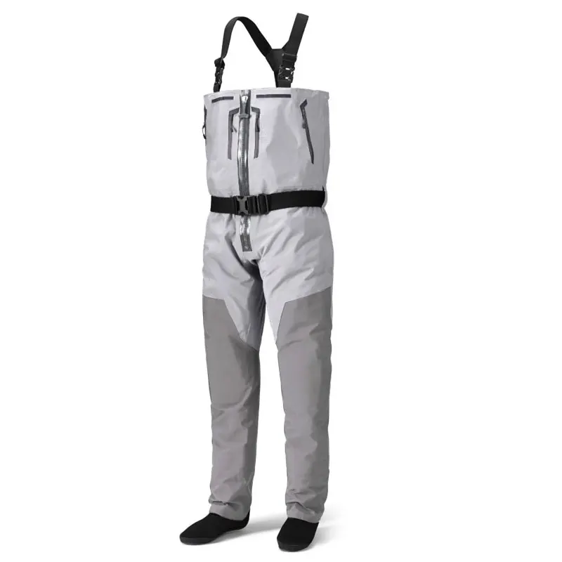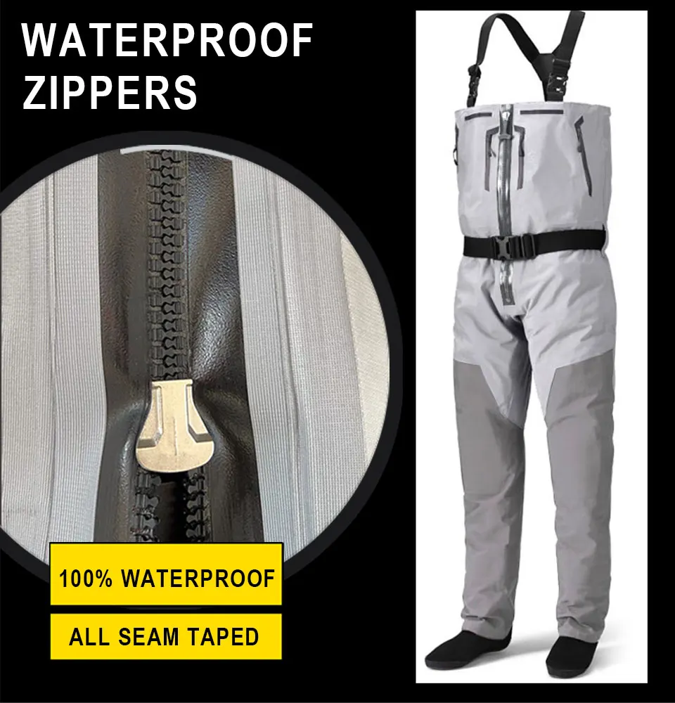 Para mayor comodidad, comodidad y rápido encendido y apagado, nada se compara con un Vadeador con cremallera. Los problemas de comodidad son obvios, El SEAKIRIN Wader es el Vadeador transpirable más duradero, resistente a la abrasión y rico en características que hemos construido. Construido con tela exclusiva de nailon 100% con cuatro capas en la parte superior, la adición de una cremallera impermeable de dientes grandes probada durante más de 200 días, proporciona un nivel notable de comodidad y rendimiento combinados. En la parte superior hay bolsillos para el calentador de manos con forro polar, dos bolsillos de almacenamiento externos con cremalleras YKK y cadena de margaritas dividida para el acoplamiento de herramientas. Dentro de bolsillos de almacenamiento internos para cajas de moscas y accesorios. Tirantes elásticos ajustables con hebillas opuestas para la conversión hasta la cintura y medias de neopreno anatómicamente correctas.