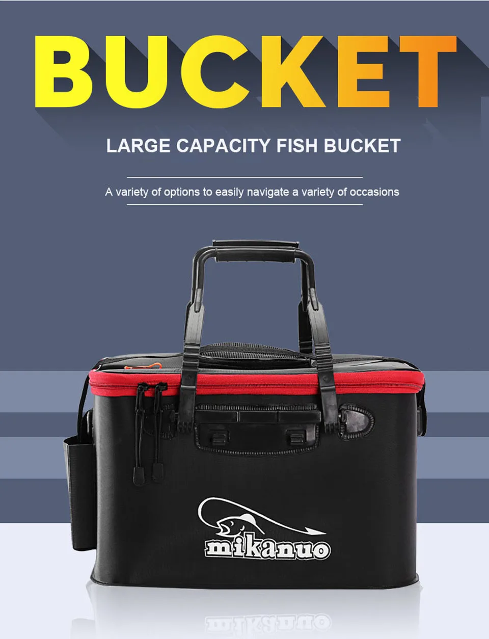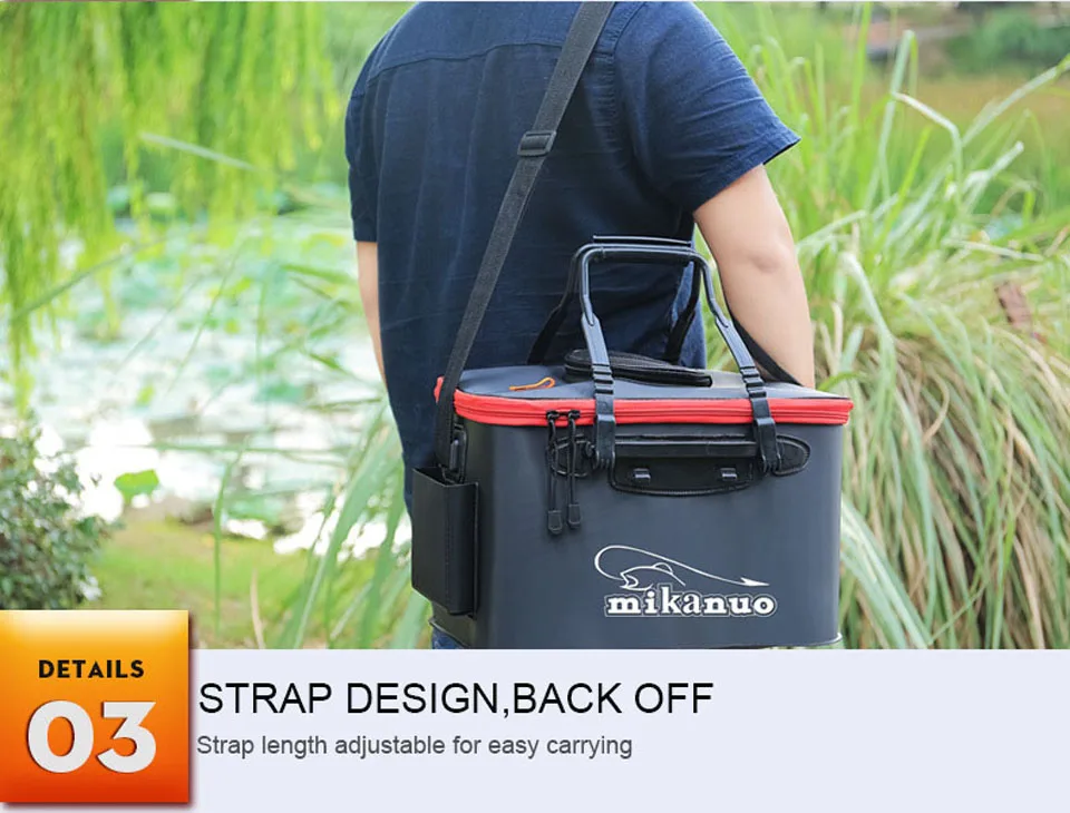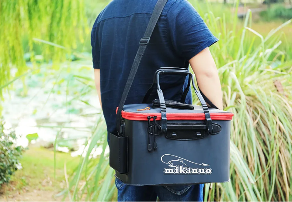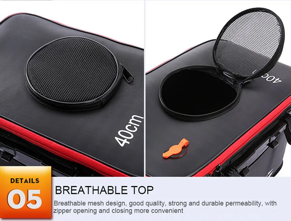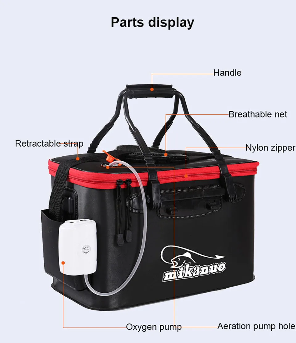 Almacenamiento de agua para acampar, senderismo, también para cebo vivo, herramientas multifuncionales. Bolsillo lateral para bomba de oxígeno, que hará que sus peces respiren, y la tapa de red hace más conveniente al poner los peces dentro y fuera.
