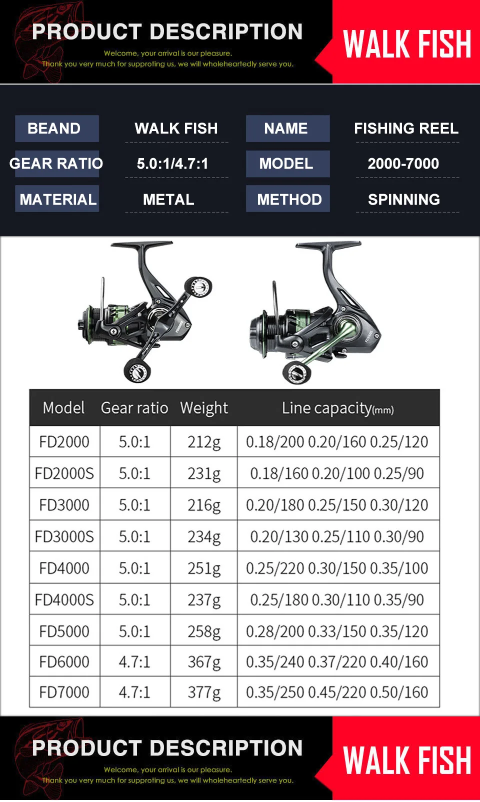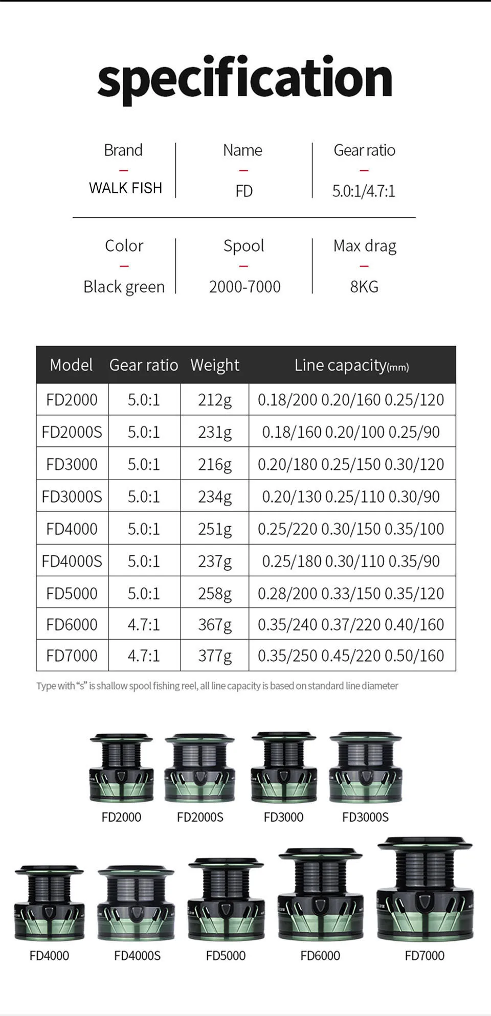 WALK FISH-carrete de pesca giratorio 1000-7000, arrastre máximo de 8Kg, relación de transmisión 5,0: 1/4, 7:1, agarre de doble Mango, carrete giratorio de alta velocidad