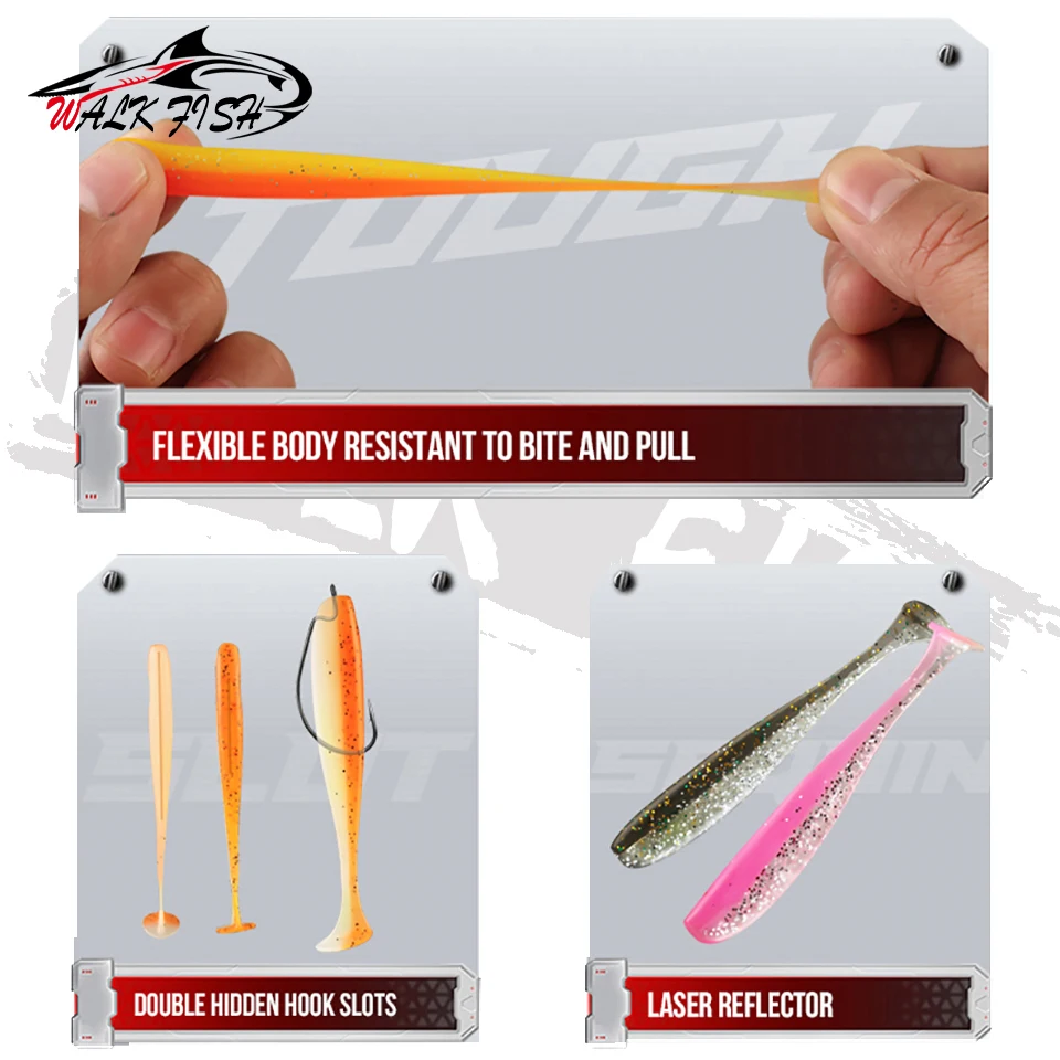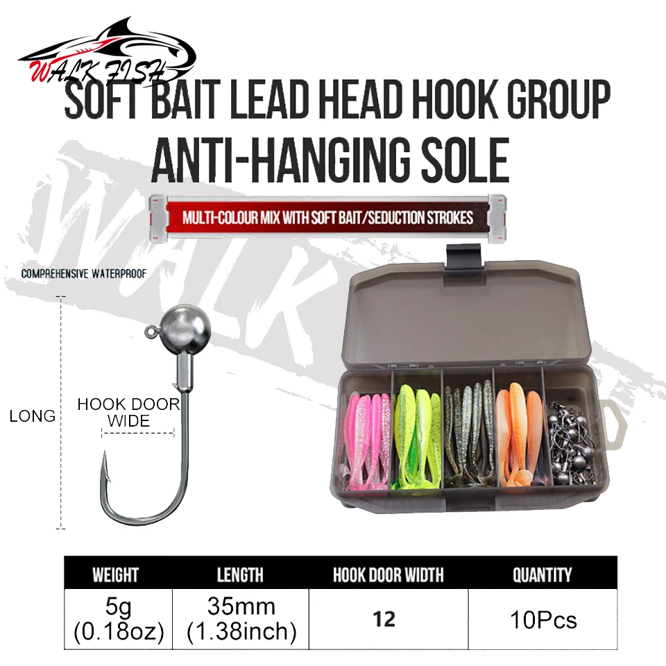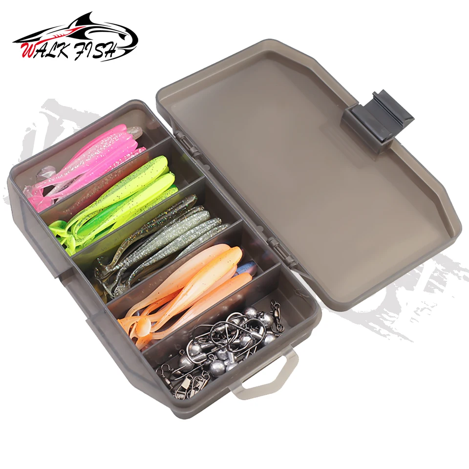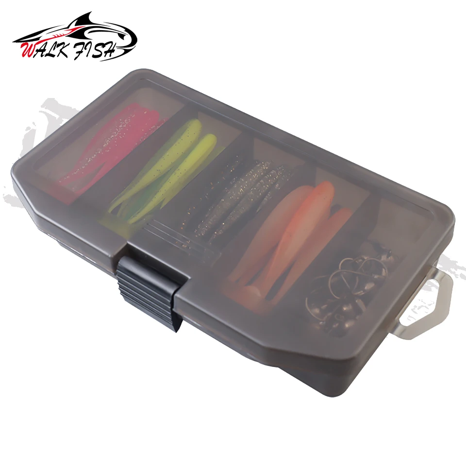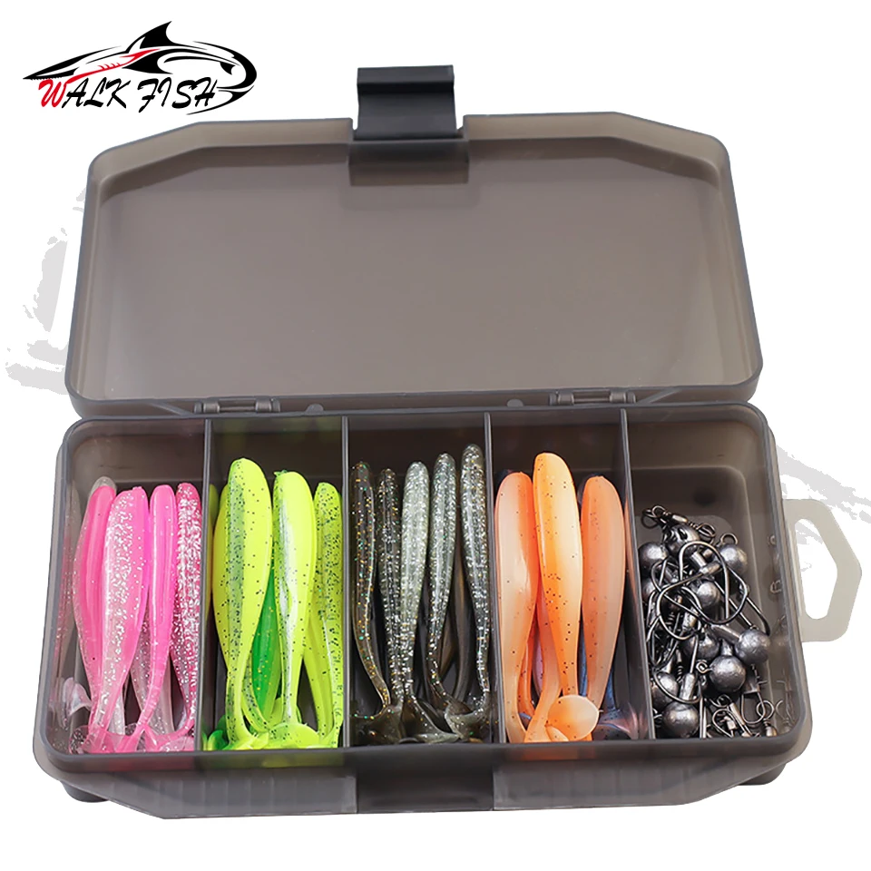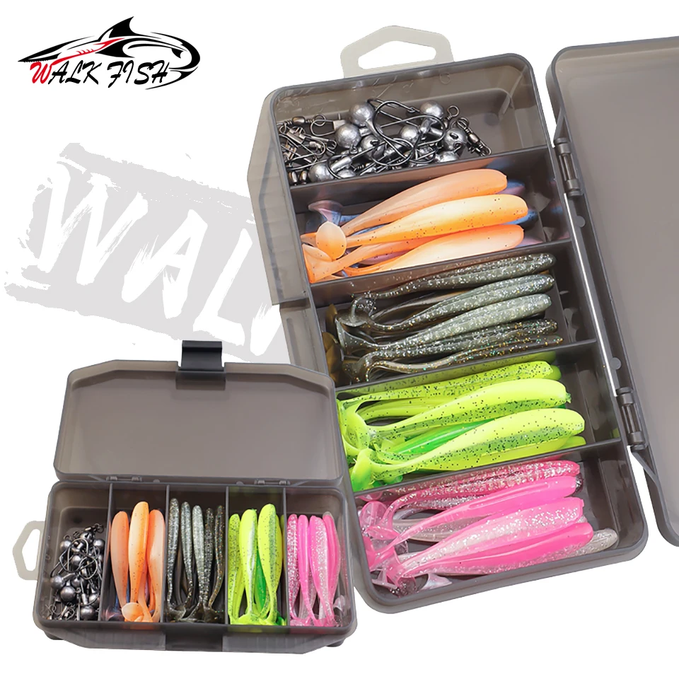 WALK FISH Juego de 61 piezas de cebo de pescado asiático Insecto suave Cola en T Gancho de cabeza de plomo Cebo suave de largo alcance Percha Señuelo de pesca mandarín