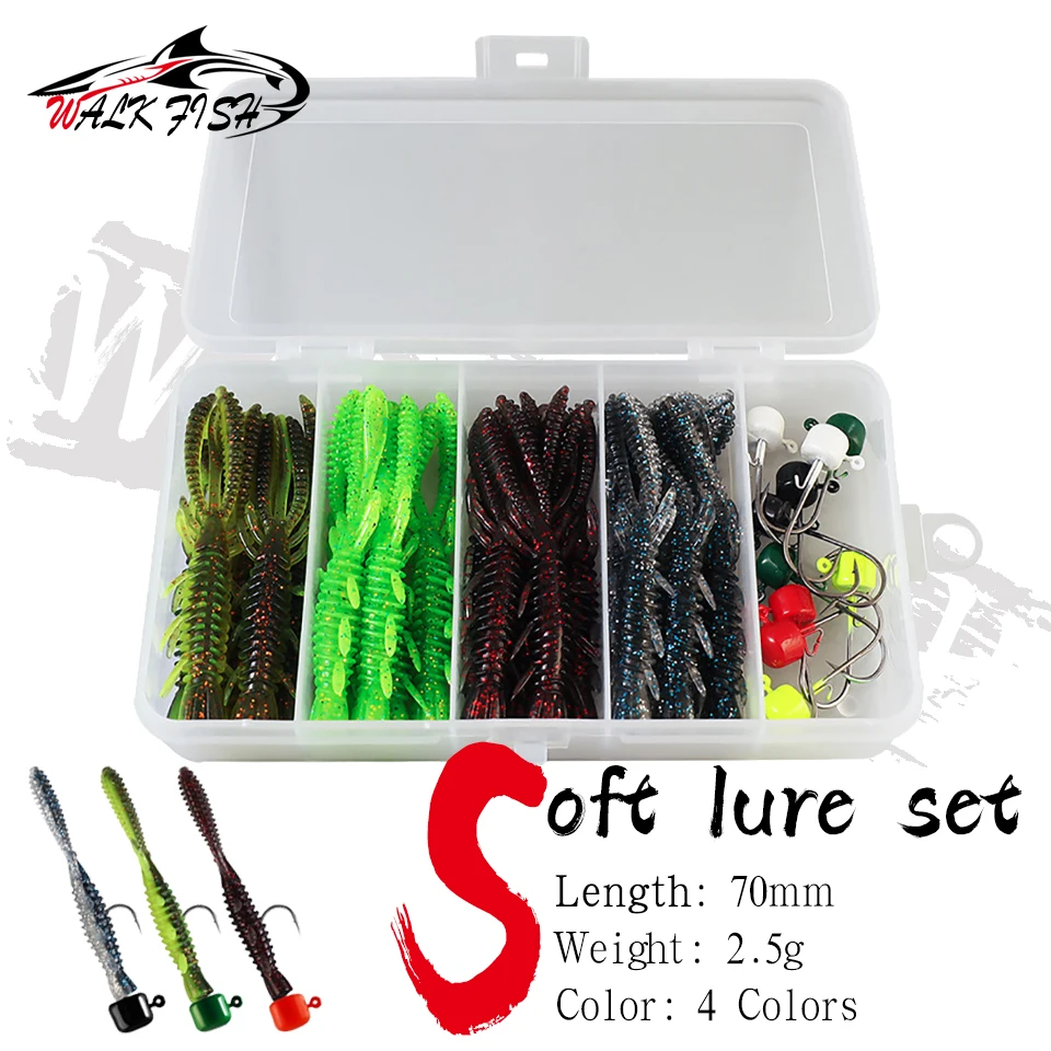 WALK FISH 31 piezas 7cm juego de señuelos de camarón flotante con anzuelo de cabeza de plomo cebo de pescado insecto suave anzuelo de camarón falso aparejos de pesca