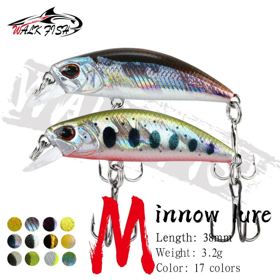 WALK FISH-señuelo de Pesca japonés, 1 piezas, 38mm, 3,2g, Mini pececillo, lubina, trucha, Wobbler, Micro señuelo de Pesca que se hunde