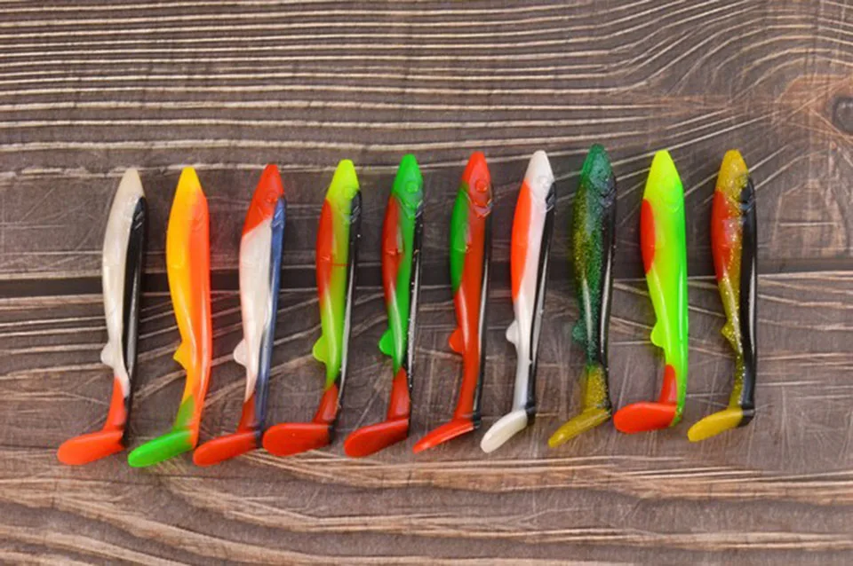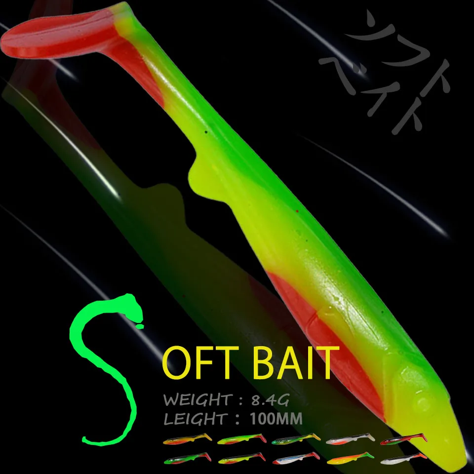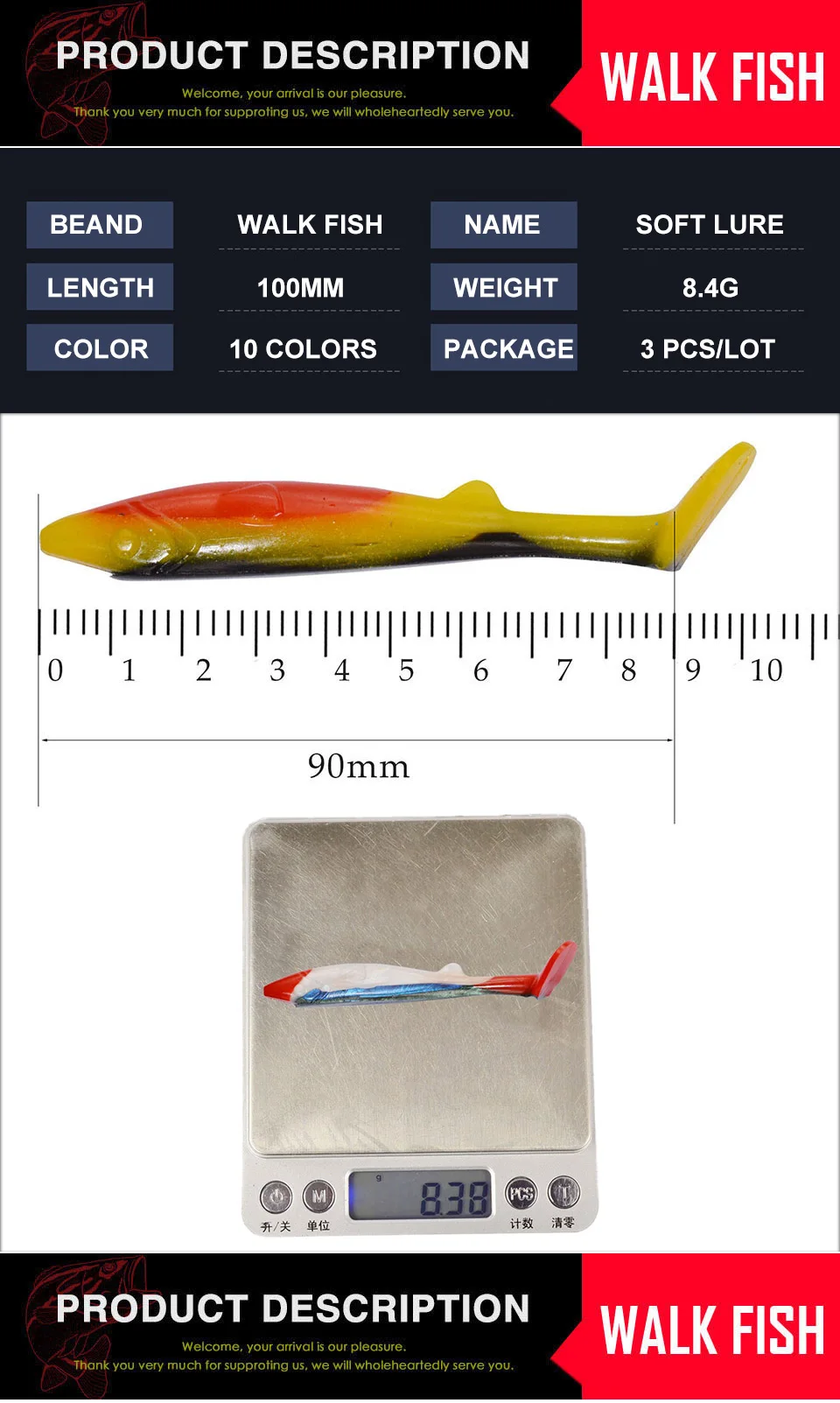 WALK FISH-señuelo de pesca suave de 3 unids/lote, 100MM/8,4G, cola en T de silicona Artificial de colores, cebo de natación, pargo, carpa, lubina