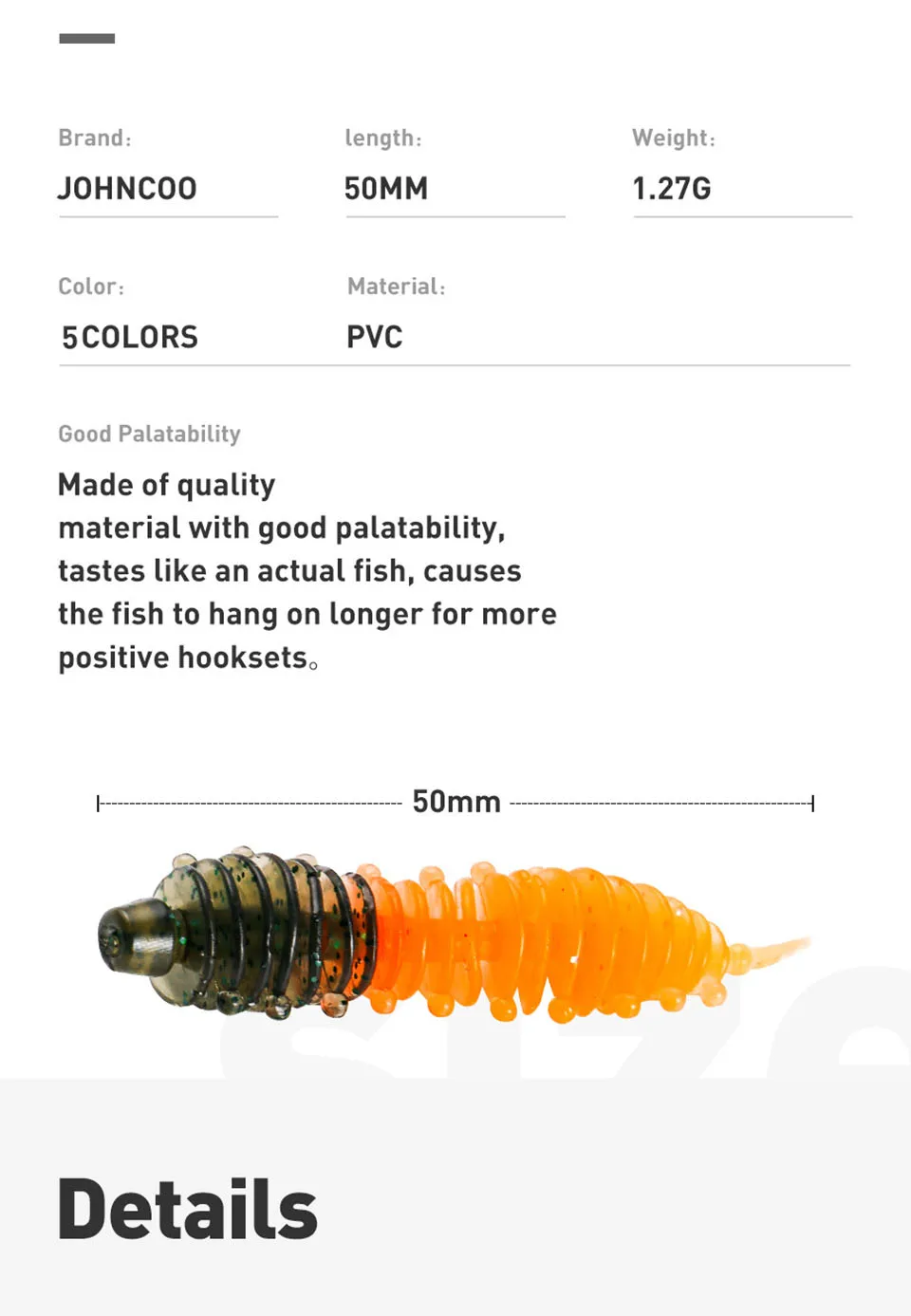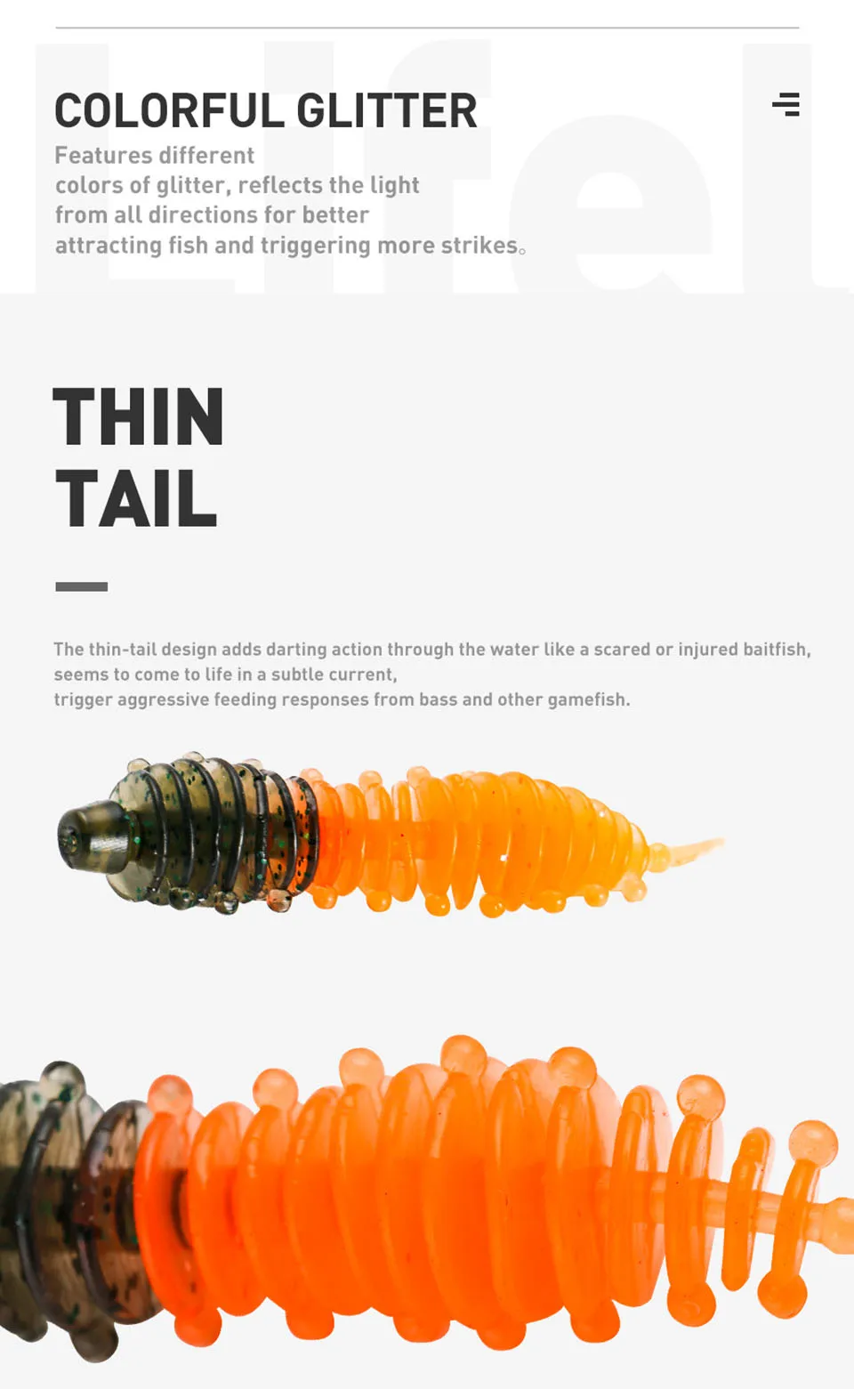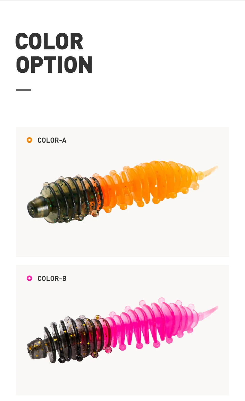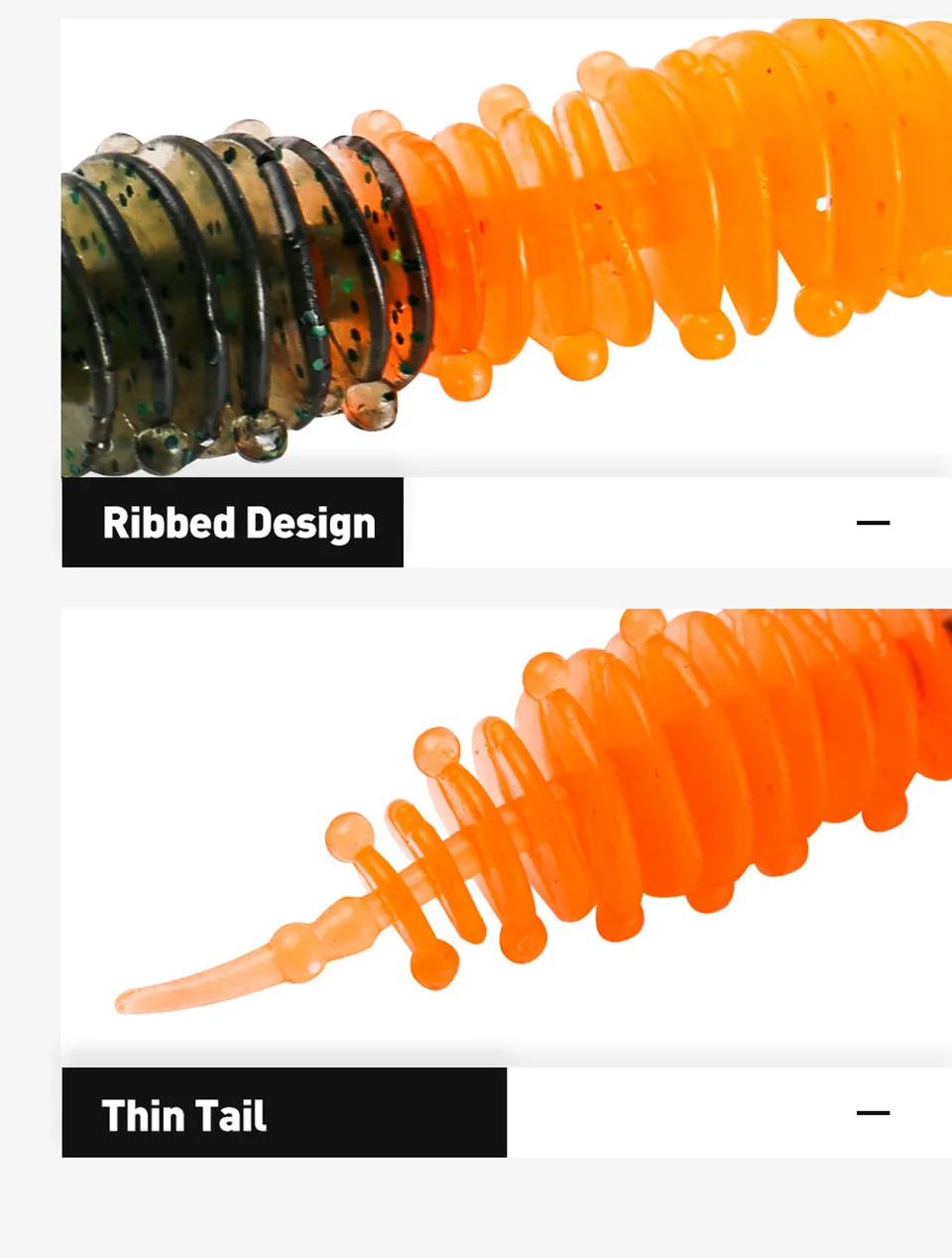 Diseño acanalado: las costillas profundas le permiten cargarlas con su aroma favorito para ese pequeño extra si lo desea, y también ayuda a la cola del señuelo a moverse a lo largo de la corriente para atraer al depredador más cercano