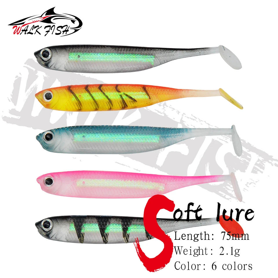 WALK FISH 5PCS/Lot Fishing Soft Bait 7.5cm 2.1g T Tail fish Fishing Lures Rainbow Color Sequin Swing Fishing Spinner Bait