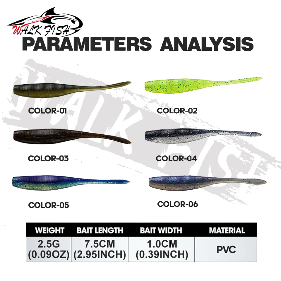 WALK FISH-señuelos blandos de Pesca, 6 uds., 7,5 cm, 2,5g, cebos de plástico Artificial de silicona, Pesca de carpa, lubina, Wobblers que se hunden