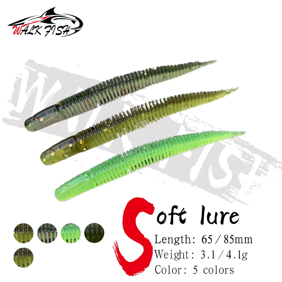 WALK FISH-Señuelos de pesca con sonrisa, cebo suave de 65mm y 85mm, gusano de baile ligero, fideos oscilantes, aguja de gusano, cola recta, lubina flotante, Manda