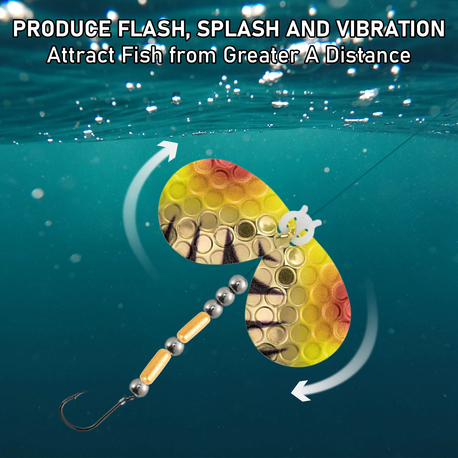 Estos aparejos de lucioperca se atan a mano con cuchillas y cuentas de colores brillantes en patrones combinados, para maximizar su atractivo y productividad. Las plataformas pueden crear continuamente destellos, salpicaduras y vibraciones en el agua, pareciendo un pez pequeño nadando, lo que ayudará a los peces a localizar su señuelo en cualquier condición de agua y atraer a los peces grandes para que muerdan el anzuelo.