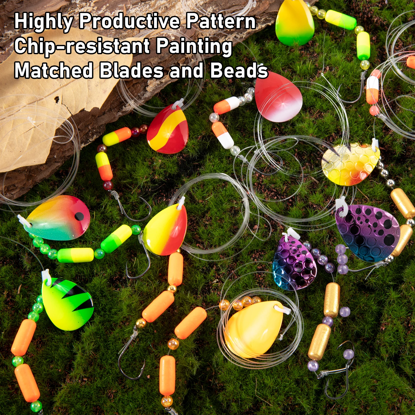 Este Kit de aparejos de lucioperca incluye 10 aparejos de lucioperca únicos en 10 colores diferentes: Half Rigs incluye un #3 Colorado Blade, la otra mitad de los aparejos equipados con el #4 Colorado Blade. Cada aparejo tiene 2 flotadores de un tipo, 1 anzuelo de pulpo n. ° 2, una horquilla, un mono de 15 libras y seis cuentas de pesca.