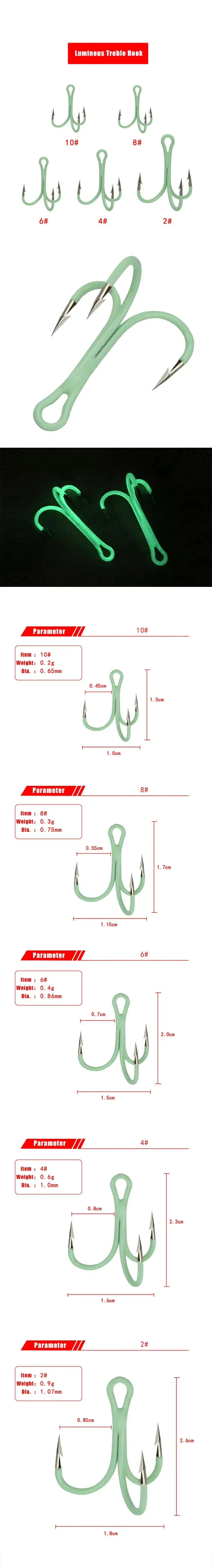 WEIHE 10 piezas 2 # 4 # 6 # 8 # 10 # Anzuelos triples luminosos con púas, anzuelo de pesca de acero rico en carbono