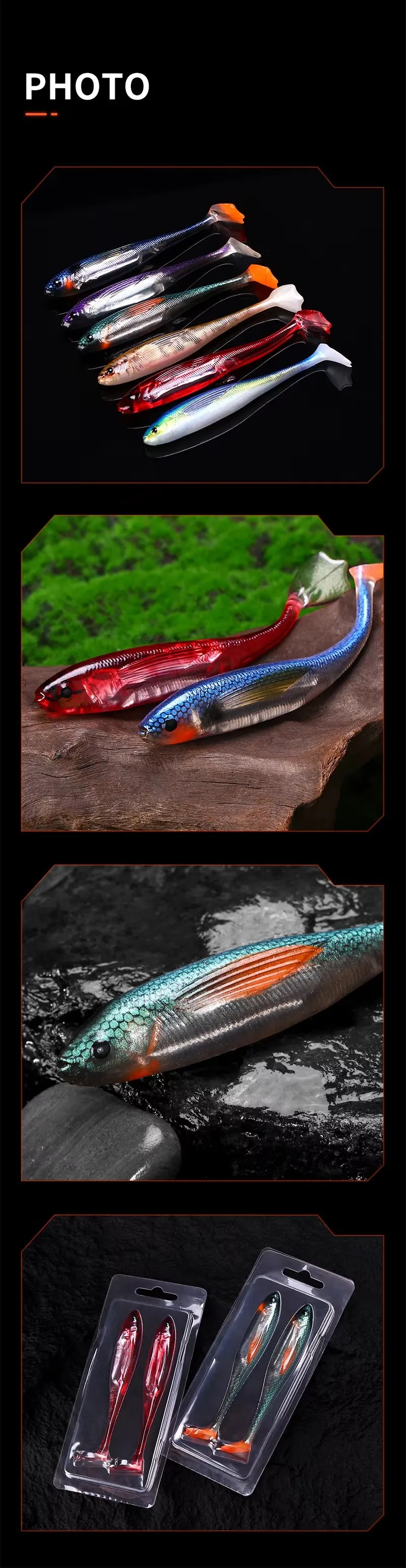 Información del producto Nombre del producto: señuelo de pez suave con cola en T Material: PVC Longitud: 12,5 cm Peso: 10 g Color: 6 colores Paquete: 2 unidades/caja blister Más detalles se encuentran en las siguientes imágenes.
