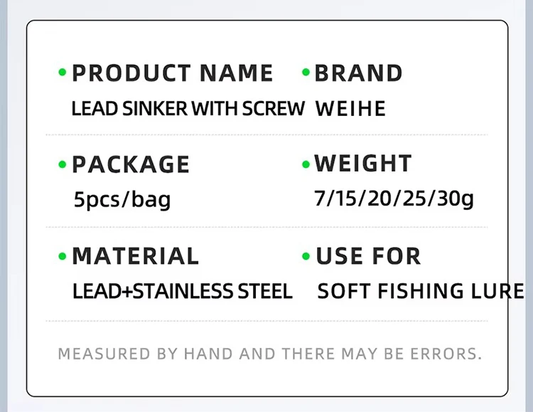 Descripción generalWEIHE 7g15g20g25g30g plomo con tornillo accesorios de pesca pesca agua dulce accesorio de peso de pesca de agua salada