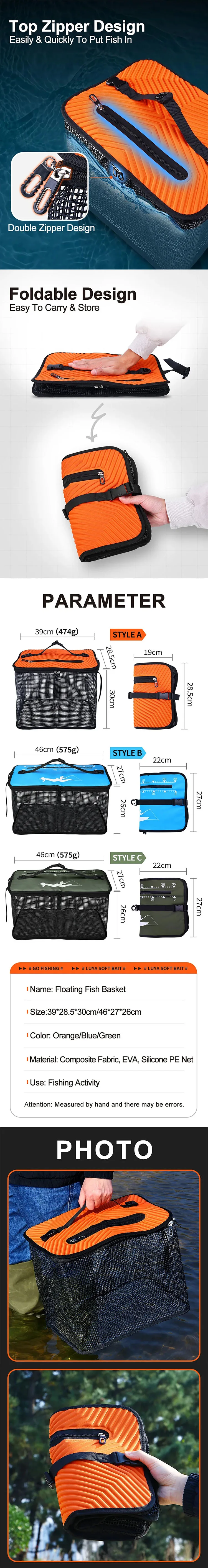 Información del producto Nombre del producto: cesta flotante para peces Material: tela compuesta, EVA, red de silicona PE Tamaño: 39*28,5*30cm/46*27*26cm Peso: 474 g/575 g Color: naranja/azul/verde oscuro Característica: 1.Diseño flotante, fácil de llevar. 2.Diseño flotante, cómodo de usar. 3.Con cuerda antideslizante, para asegurar la cesta de pescado y evitar que flotar. Paquete: Bolsa OPP Más detalles se encuentran en las siguientes imágenes.