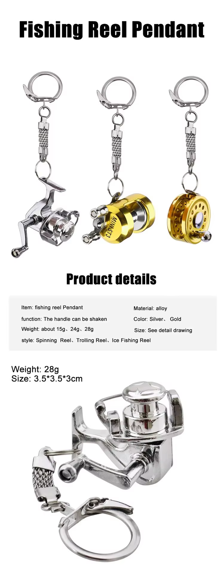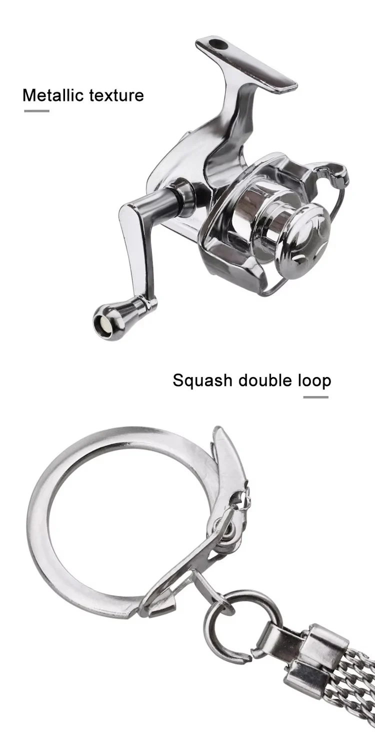 Llavero con rueda de pez, Color dorado, pescador con mosca, carrete de pesca giratorio, personaje, llavero en miniatura con llavero