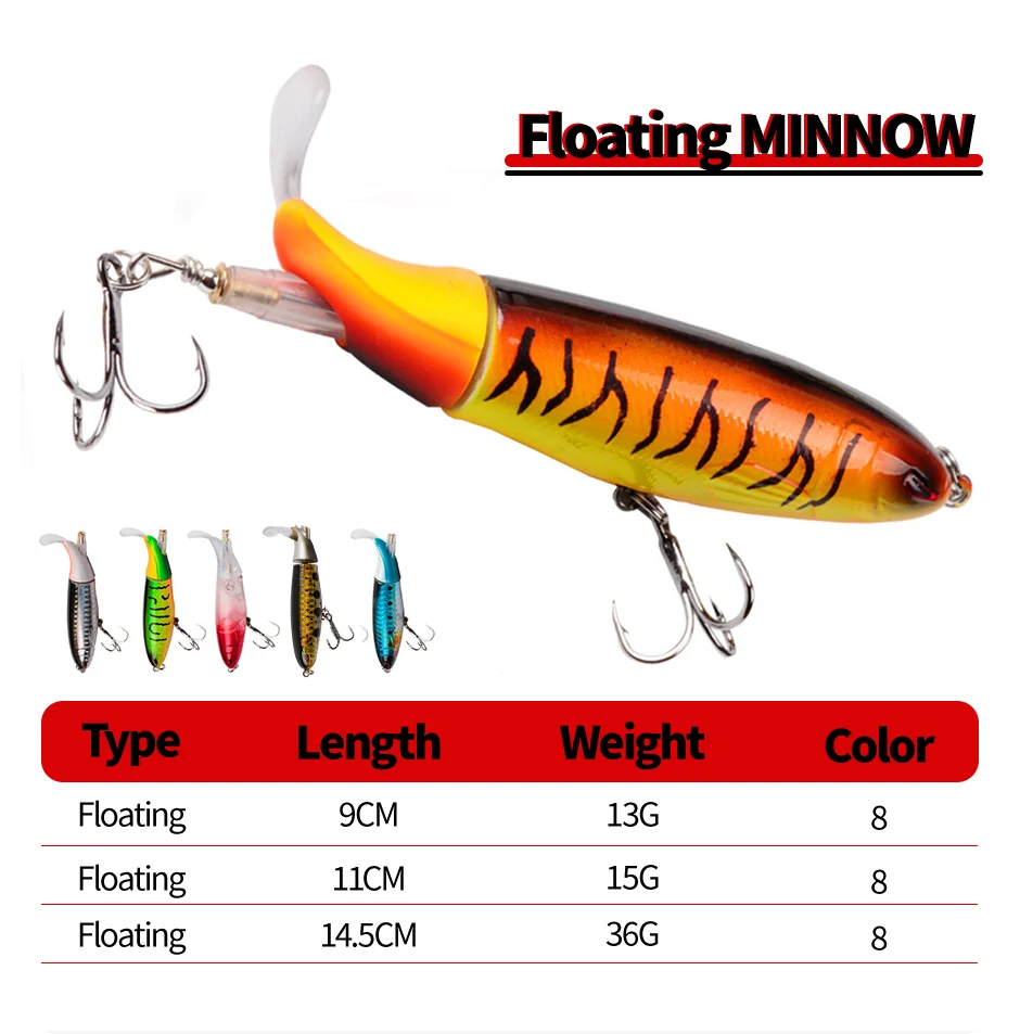• Diseño de Wobblers Rotativos :El diseño de wobblers rotativos imita el movimiento de un pez real, lo que atrae a los peces y les induce a masticar.