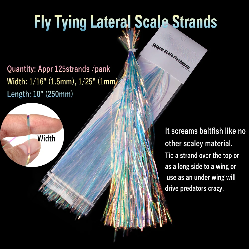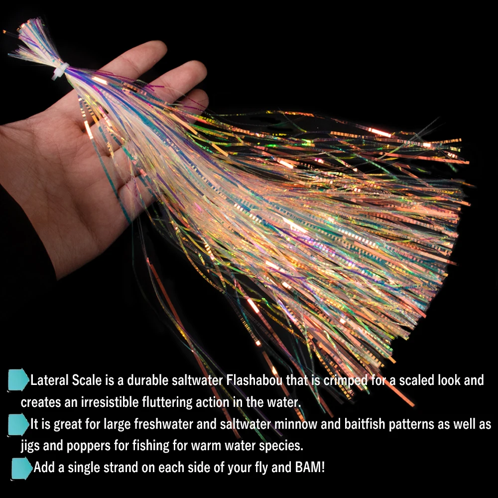 --Lateral Scale is a durable saltwater Flashabou that is crimped for a scaled look and creates an irresistible fluttering action in the water.
