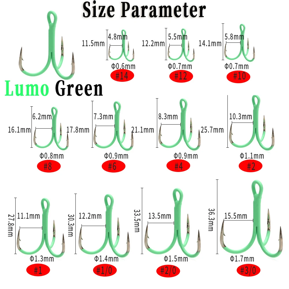 [Múltiples tamaños] Hay 11 tamaños de gancho. Suficientes anzuelos triples para diferentes tamaños de señuelos duros.