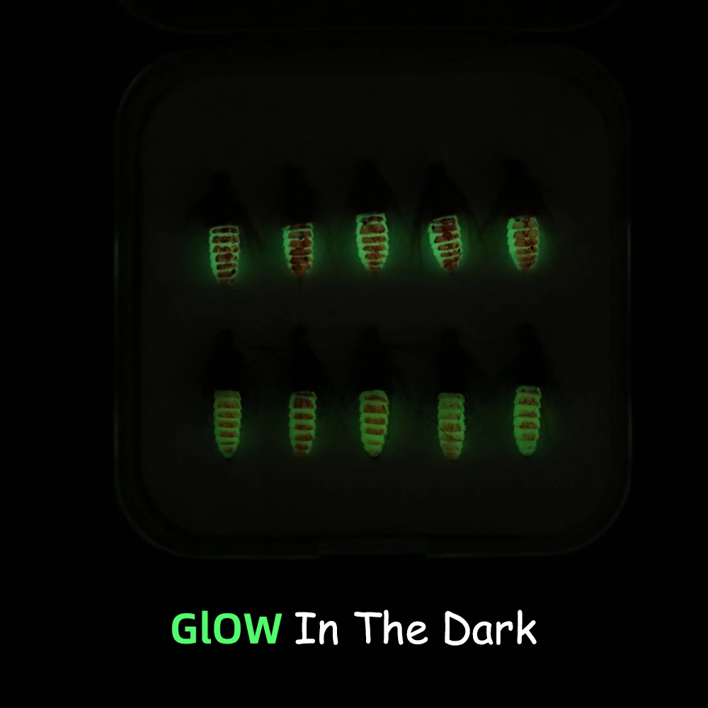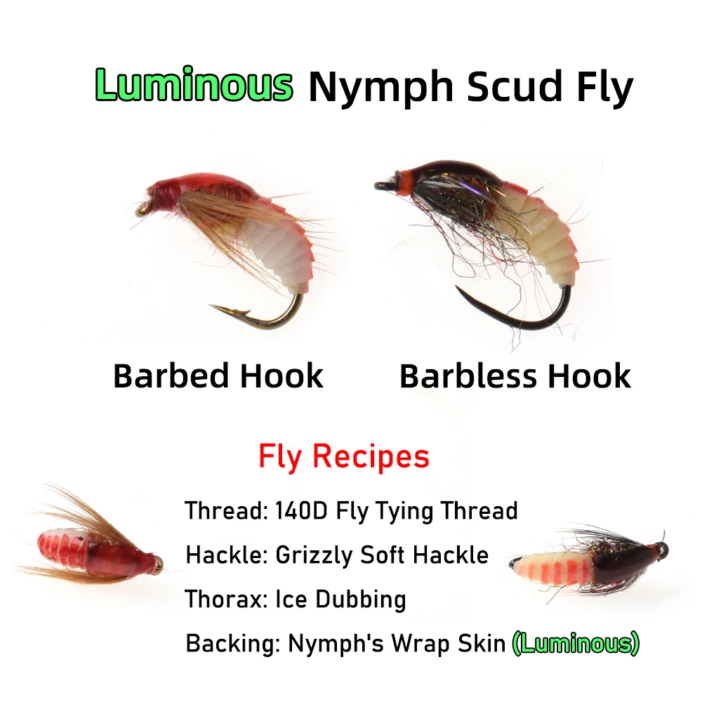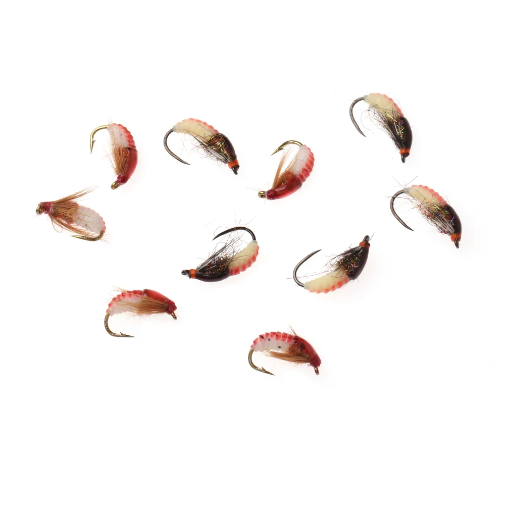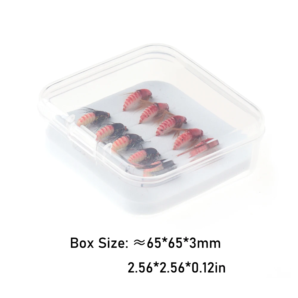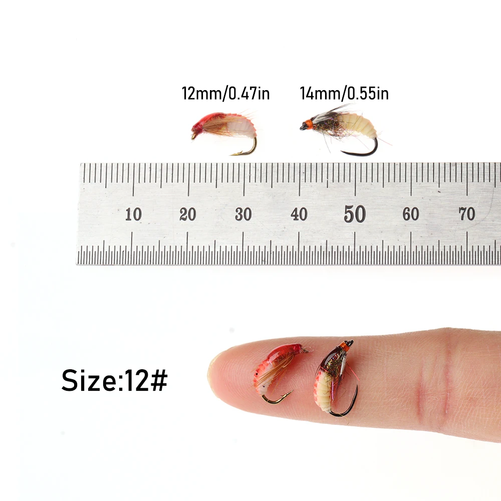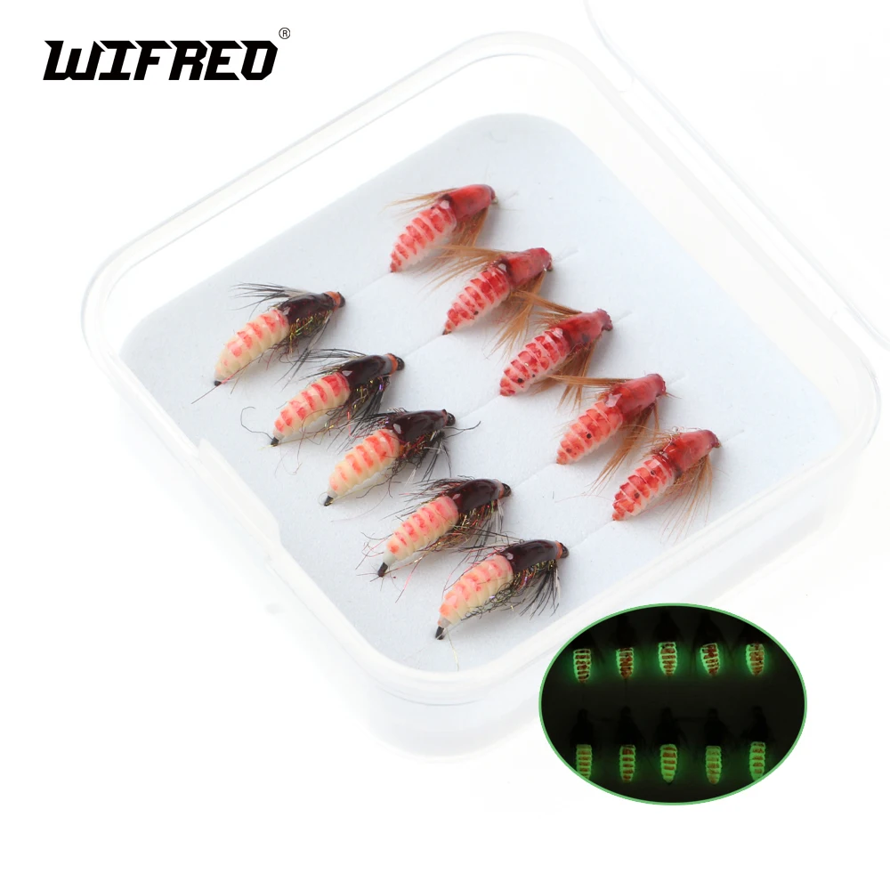 WIFREO 10 unids/caja 12# Luminoso Scud Ninfa moscas realista Bug Worm trucha lubina percha señuelo de pesca con mosca cebos con anzuelo sin púas y sin púas