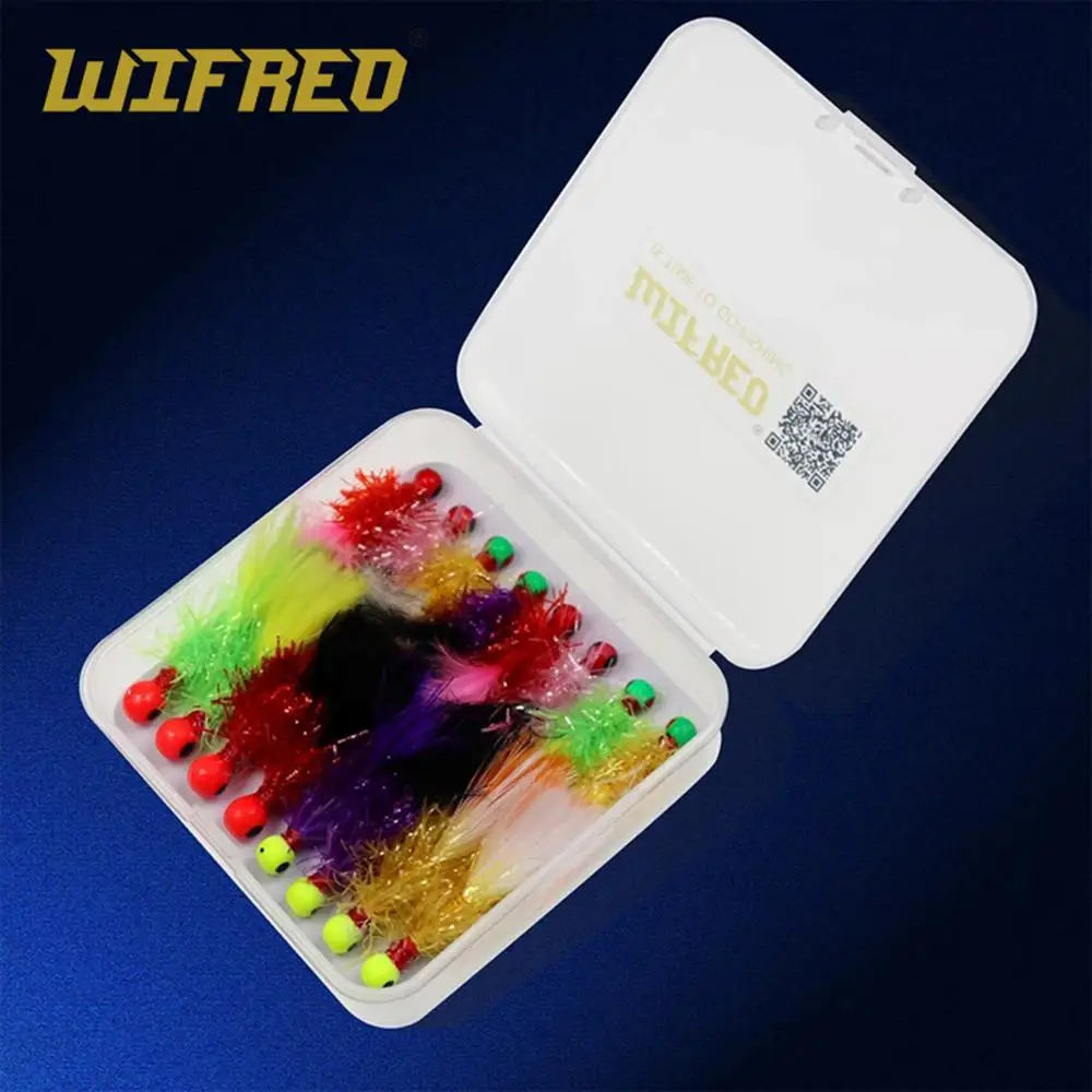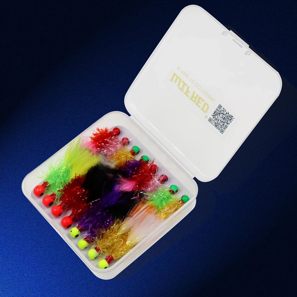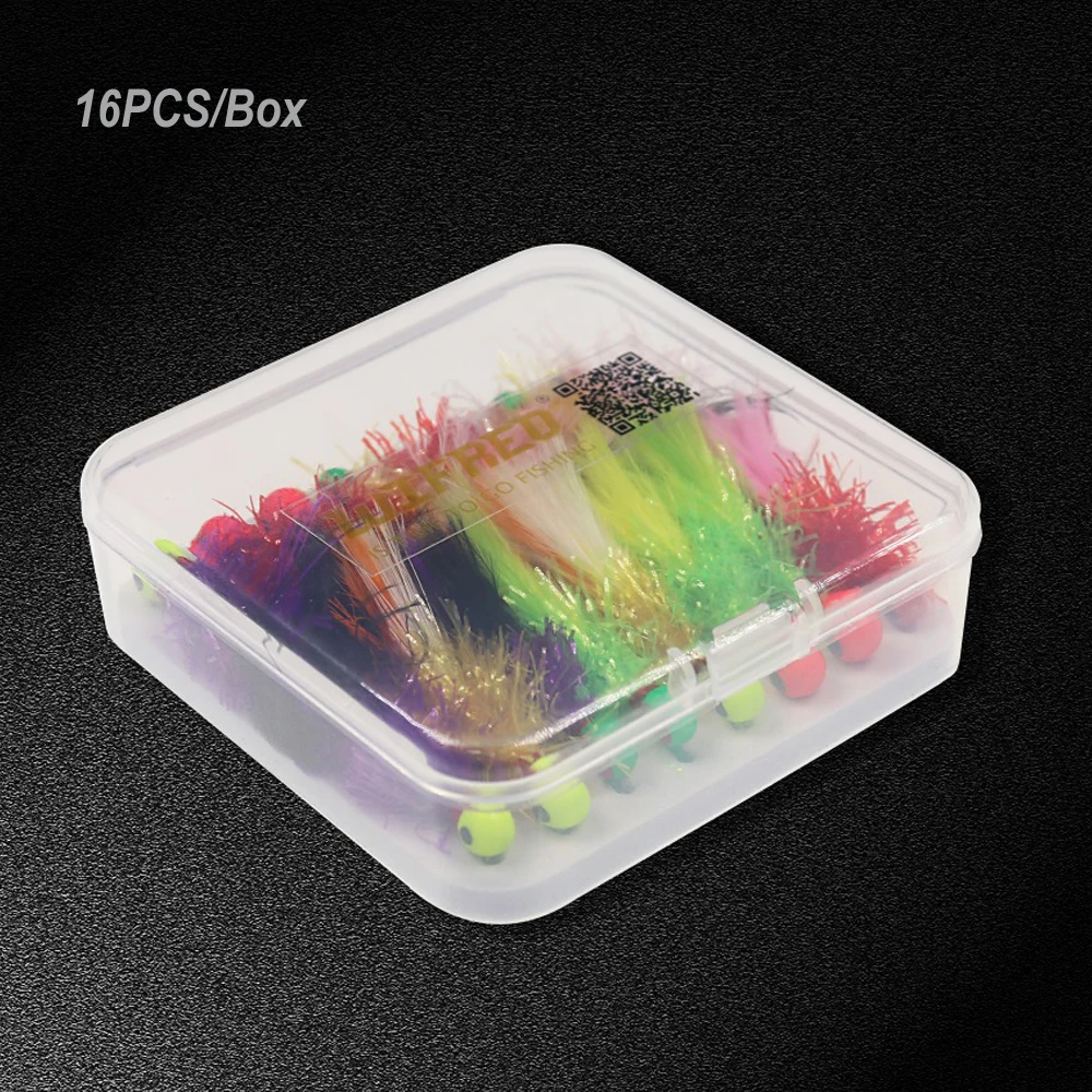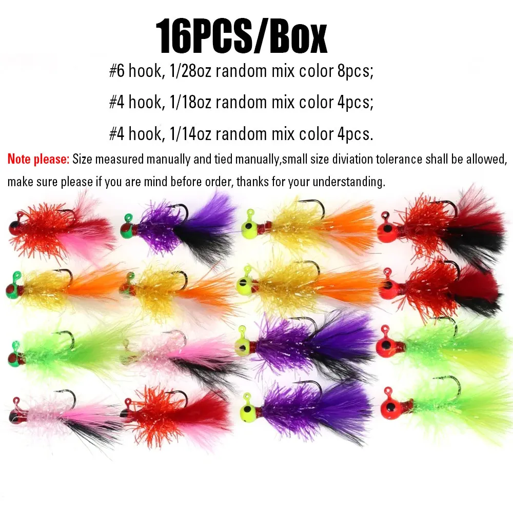 Wifreo 16 unids/caja mezcla Mini Marabou Crappie Jig Pan peces Jigs Señuelos de pesca en hielo para anzuelo de pesca Bluegill 6 4 en caja de señuelos
