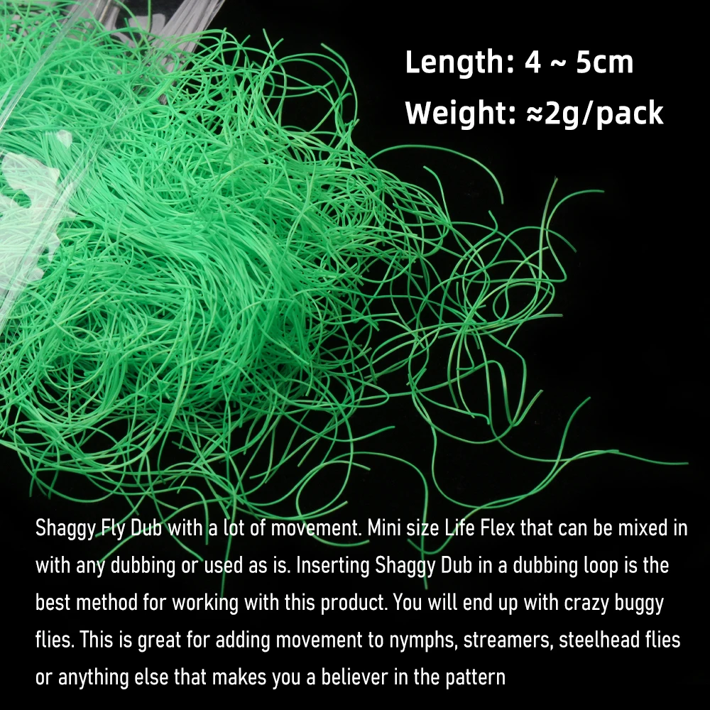 Mirco Shaggy Fly Dub con mucho movimiento. Tamaño mini Life Flex que se puede mezclar con cualquier doblaje o usar tal cual. Insertar Shaggy Dub en un bucle de doblaje es el mejor método para trabajar con este producto. Terminarás con moscas de buggy locas. Esto es ideal para agregar movimiento a ninfas, serpentinas, moscas Steelhead o cualquier otra cosa que te haga creer en el patrón