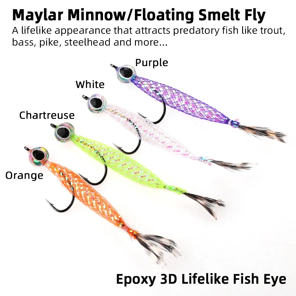 Mylar Minnow Fly es un patrón de serpentinas popular y eficaz que se utiliza en la pesca con mosca para imitar pequeños peces cebo.Es conocido por su cuerpo llamativo y reflectante, que imita las escamas brillantes de los pececillos y otros peces pequeños. Una apariencia realista que atrae a los peces depredadores como truchas, lubinas, lucios, truchas y más...