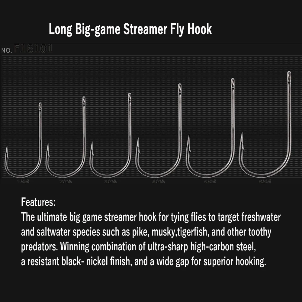 Características: El gancho definitivo para serpentinas de juegos grandes para atar moscas para apuntar a especies de agua dulce y salada como lucio, almizcle, merpas y otros depredadores dentados.Combinación ganadora de acero ultraafilado con alto contenido de carbono, un resistente acabado en níquel negro y un amplio espacio para un enganche superior.
