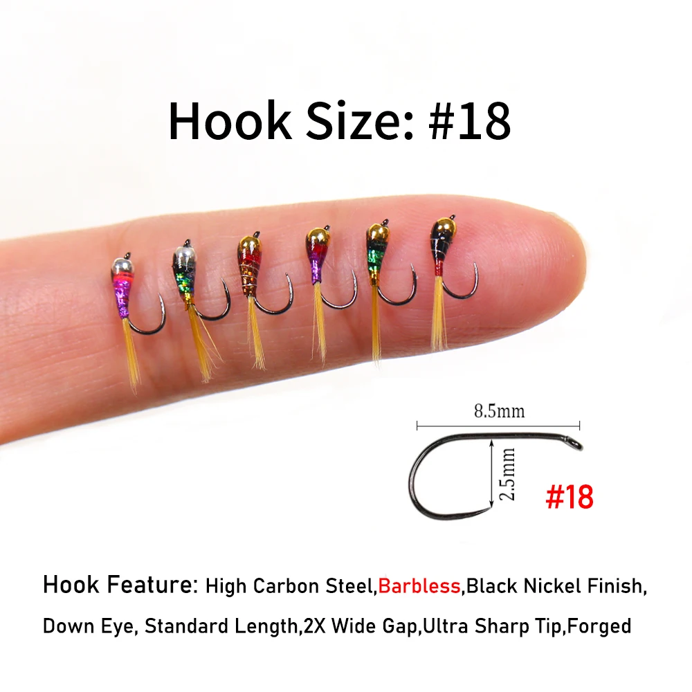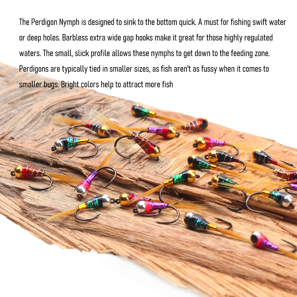 The Perdigon Nymph is designed to sink to the bottom quick. A must for fishing swift water or deep holes. Barbless extra wide gap hooks make it great for those highly regulated waters. The small, slick profile allows these nymphs to get down to the feeding zone. Perdigons are typically tied in smaller sizes, as fish aren't as fussy when it comes to smaller bugs. Bright colors help to attract more fish.