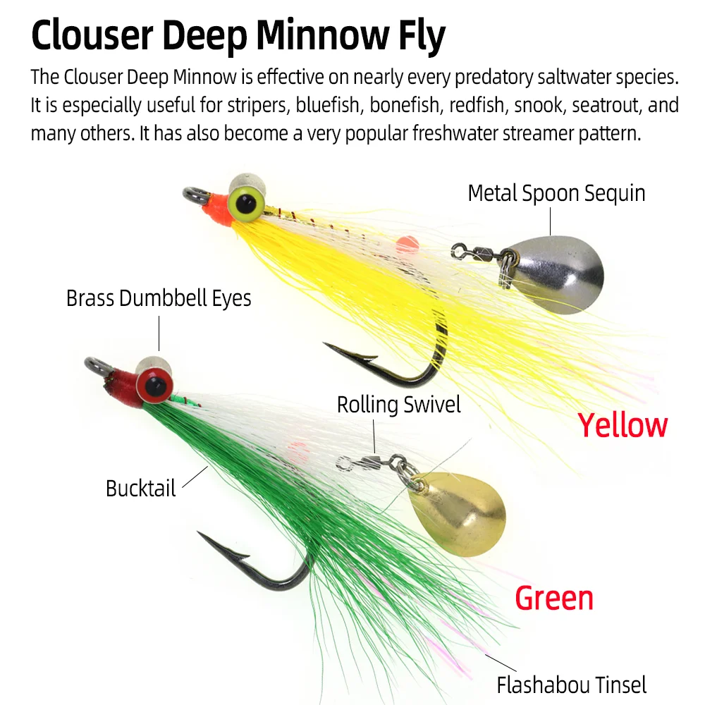 El Clouser Deep Minnow es eficaz en casi todas las especies de agua salada depredadora.Es especialmente útil para stripers, peces azul, huesos, gallos rojos, snook, trucha marina y muchos otros.También se ha convertido en un patrón de serpentinas de agua dulce muy popular.