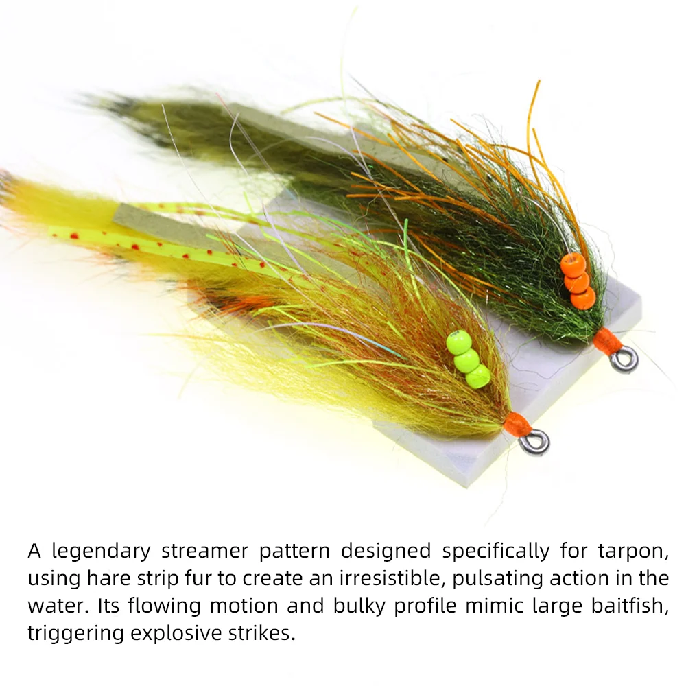 Un legendario patrón de serpentina diseñado específicamente para tarpon, utilizando pelaje de tiras de lepre para crear una acción pulsante irresistible en el agua.Su movimiento fluido y su perfil voluminoso imitan a los peces de cebo grandes, provocando golpes explosivos.