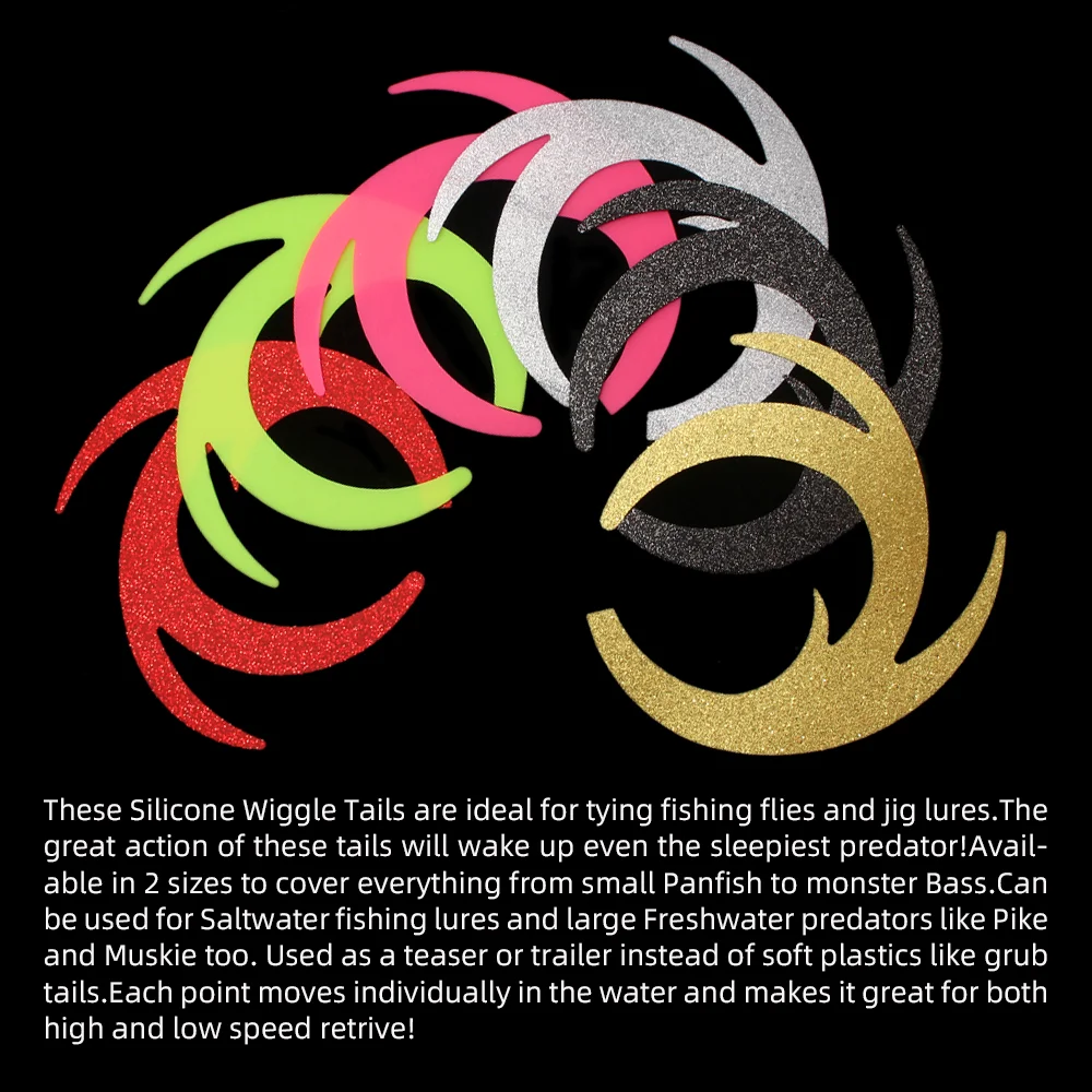 These Silicone Wiggle Tails are ideal for tying fishing flies and jig lures.The great action of these tails will wake up even the sleepiest predator!Available in 2 sizes to cover everything from small Panfish to monster Bass.Can be used for Saltwater fishing lures and large Freshwater predators like Pike and Muskie too. Used as a teaser or trailer instead of soft plastics like grub tails.Each point moves individually in the water and makes it great for both high and low speed retrive!