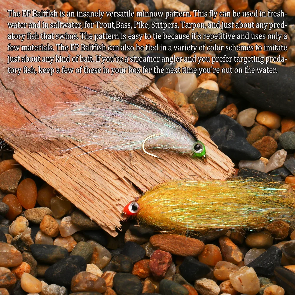 El EP Baitfish es un patrón de pececillos increíblemente versátil.Esta mosca se puede utilizar en agua dulce y salada, para truchas, lubinas, lucios, pelacables, Tarpon y casi cualquier pez depredador que nade.El patrón es fácil de atar porque es repetitivo y utiliza sólo unos pocos materiales.El EP Baitfish también se puede atar en una variedad de combinaciones de colores para imitar casi cualquier tipo de cebo.Si eres un pescador serpentín y prefieres apuntar a peces depredadores, guarda algunos de ellos en tu caja para la próxima vez que estés en el agua.