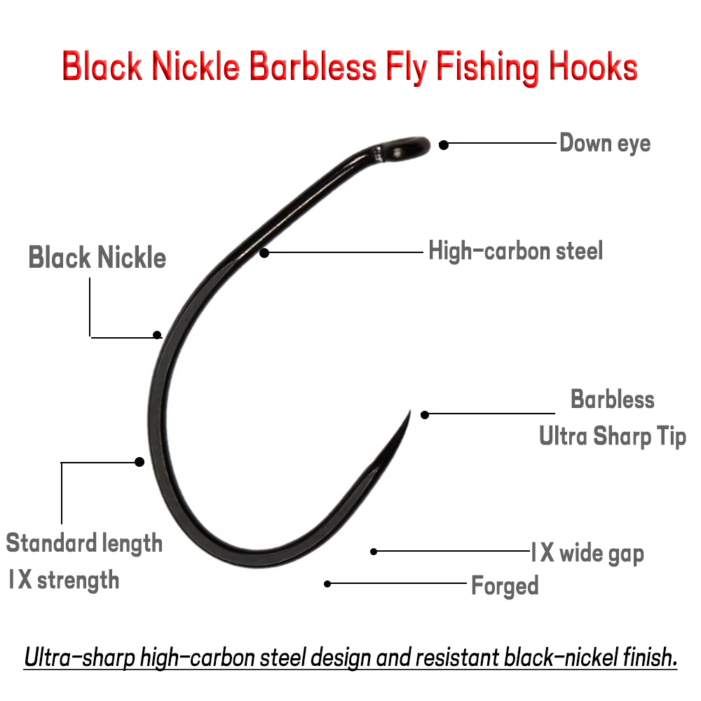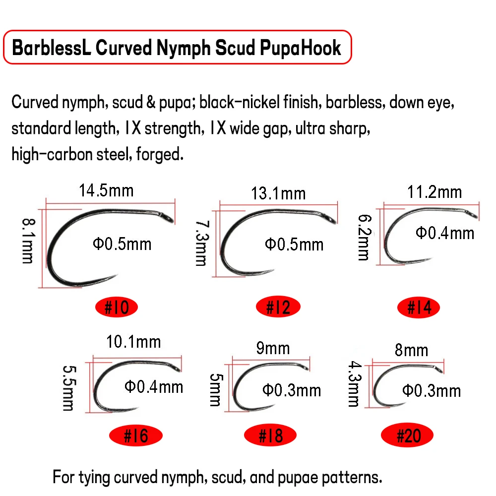 Especificaciones: Ninfe curvada, scud y pupa; Acabado en níquel negro, sin barril, ojo abajo, longitud estándar, 1X de fuerza, 1X de espacio ancho, ultra afilado, acero con alto contenido de carbono, forjado.
