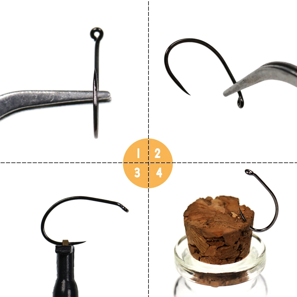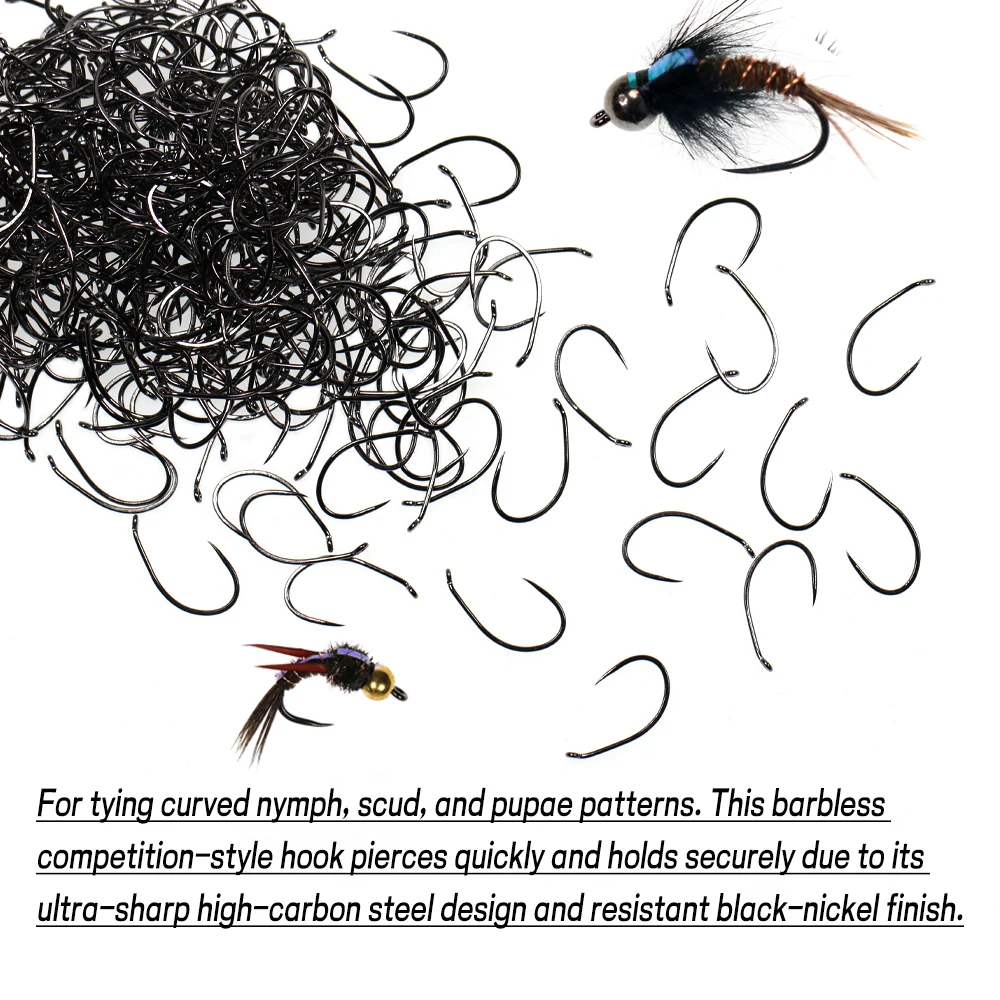 Para atar patrones curvos de ninfas, scud y pupas.Este gancho de estilo competencia sin barril se perfora rápidamente y se sujeta de forma segura gracias a su diseño ultraafilado de acero con alto contenido de carbono y su resistente acabado de níquel negro.