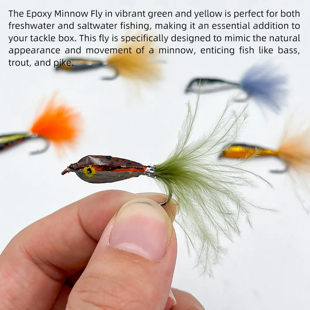 The Epoxy Minnow Fly in vibrant green and yellow is perfect for both freshwater and saltwater fishing, making it an essential addition to your tackle box. This fly is specifically designed to mimic the natural appearance and movement of a minnow, enticing fish like bass, trout, and pike.