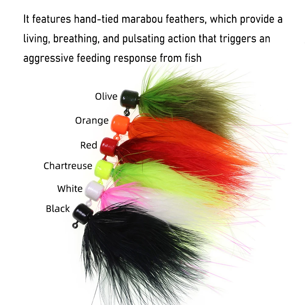 Estos jigs son realmente buenos para el tipo de pez, la perca y el pez del sol y para todas las especies de trucha y salmón.También es eficaz para lubina, lucioperca y otras especies de agua dulce. Cuenta con plumas de marabe atadas a mano, que brindan una acción viva, respirable y pulsante que desencadena una respuesta de alimentación agresiva de los peces.