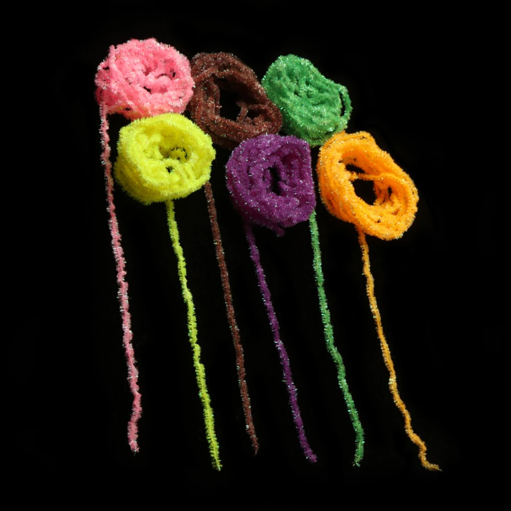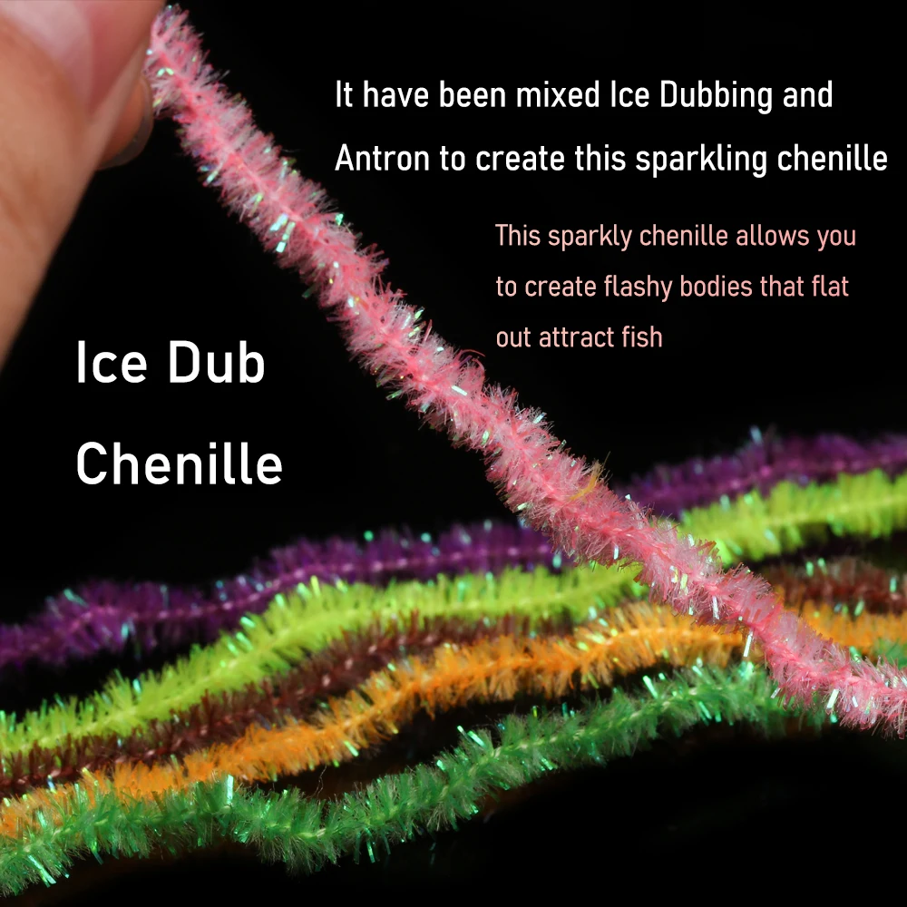 Lce Dub Chenille ha sido mezclado Ice Dubbing y Antron para crear esta chenilla brillante.Agrega la cantidad justa de destellos para que se enciendan sin el volumen de algunas chenillas. Esta chenilla brillante le permite crear cuerpos llamativos que atraen a los peces.