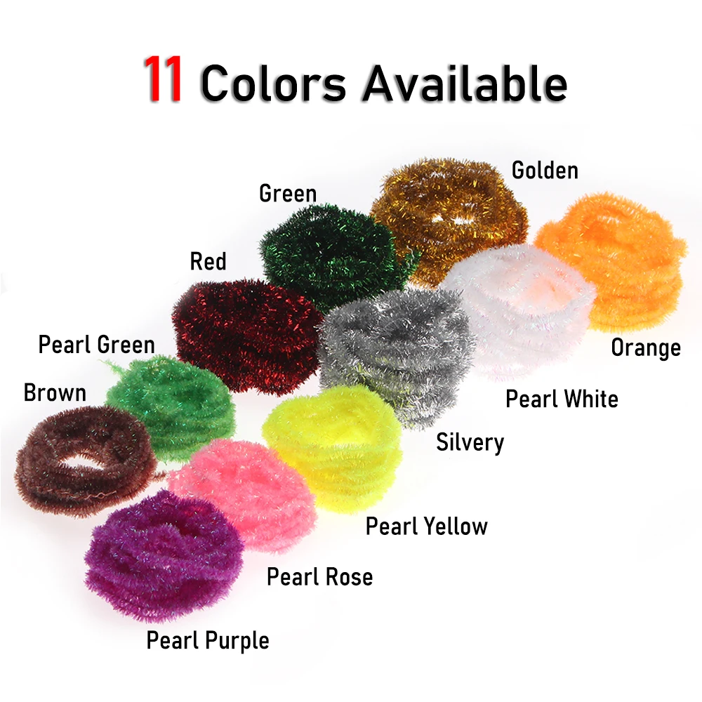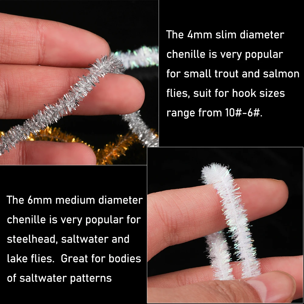 - La chenilla de diámetro medio de 6 mm es muy popular para las moscas de acero, agua salada y lagos.Este aspecto resistente y denso de la chenilla es ideal para cuerpos de patrones de agua salada.