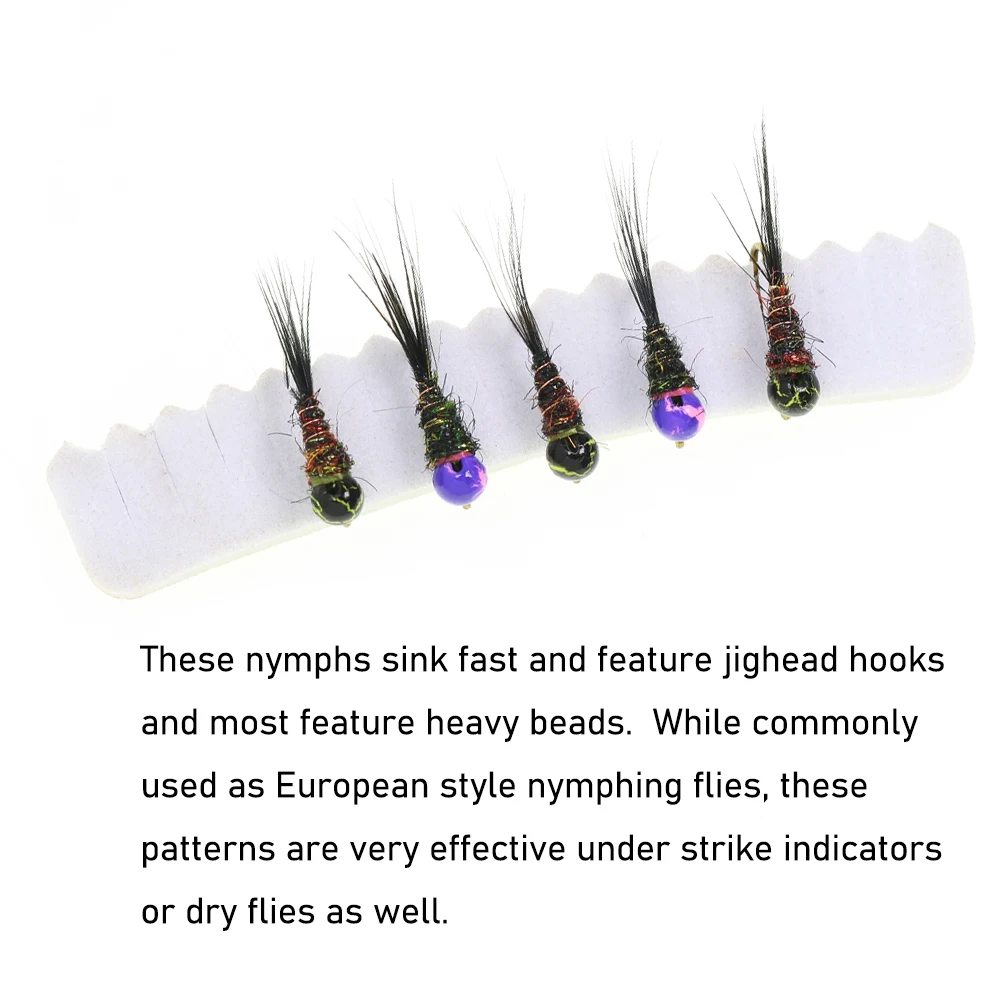 Estas ninfas se hunden rápidamente y cuentan con ganchos de cabeza plana y la mayoría cuentan con cuentas pesadas.Si bien se utilizan habitualmente como moscas de ninfas de estilo europeo, estos patrones también son muy efectivos bajo indicadores de golpe o moscas secas.Tienen a deslizarse sobre las rocas y minimizar los enganches aunque son pesados y entren en contacto frecuente con el fondo.También es mucho más probable que enganche la trucha en el labio superior, dando al pescador más control y una mayor capacidad para pescar la trucha.