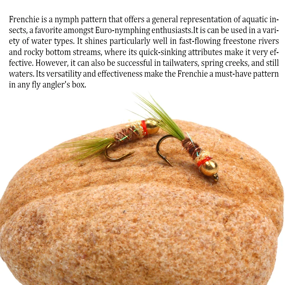 Frenchie is a nymph pattern that offers a general representation of aquatic insects, a favorite amongst Euro-nymphing enthusiasts.It is can be used in a variety of water types. It shines particularly well in fast-flowing freestone rivers and rocky bottom streams, where its quick-sinking attributes make it very effective. However, it can also be successful in tailwaters, spring creeks, and still waters. Its versatility and effectiveness make the Frenchie a must-have pattern in any fly angler's box.