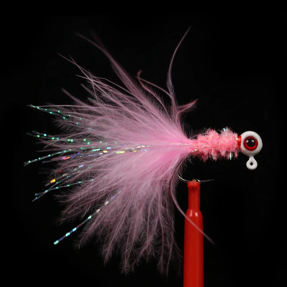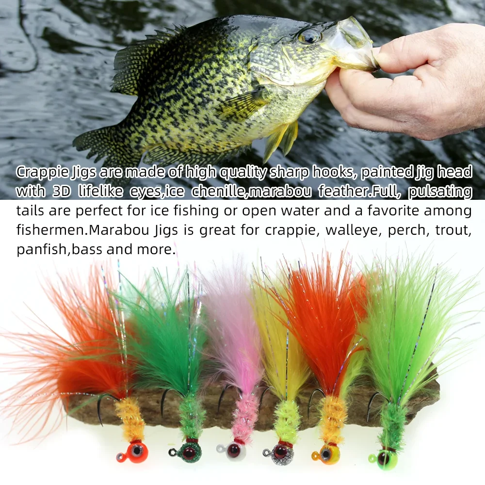 Crappie Jigs are made of high quality sharp hooks, painted jig head with 3D lifelike eyes,ice chenille,marabou feather.Full, pulsating tails are perfect for ice fishing or open water and a favorite among fishermen.Marabou Jigs is great for crappie, walleye, perch, trout, panfish,bass and more.