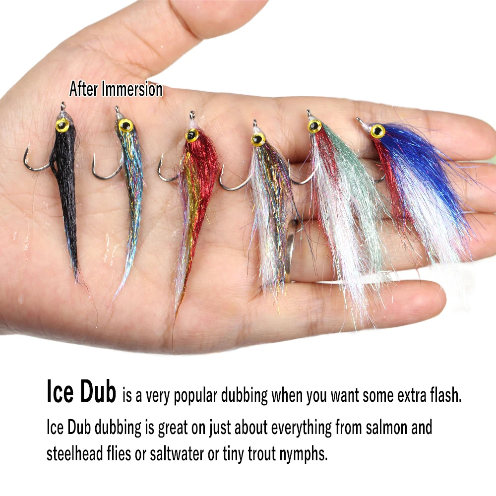 Ice Dub es un doblaje muy popular cuando quieres un poco de flash extra. El doblaje Ice Dub es excelente para casi todo, desde salmones y moscas de trucha arco iris o agua salada o pequeñas ninfas de trucha.