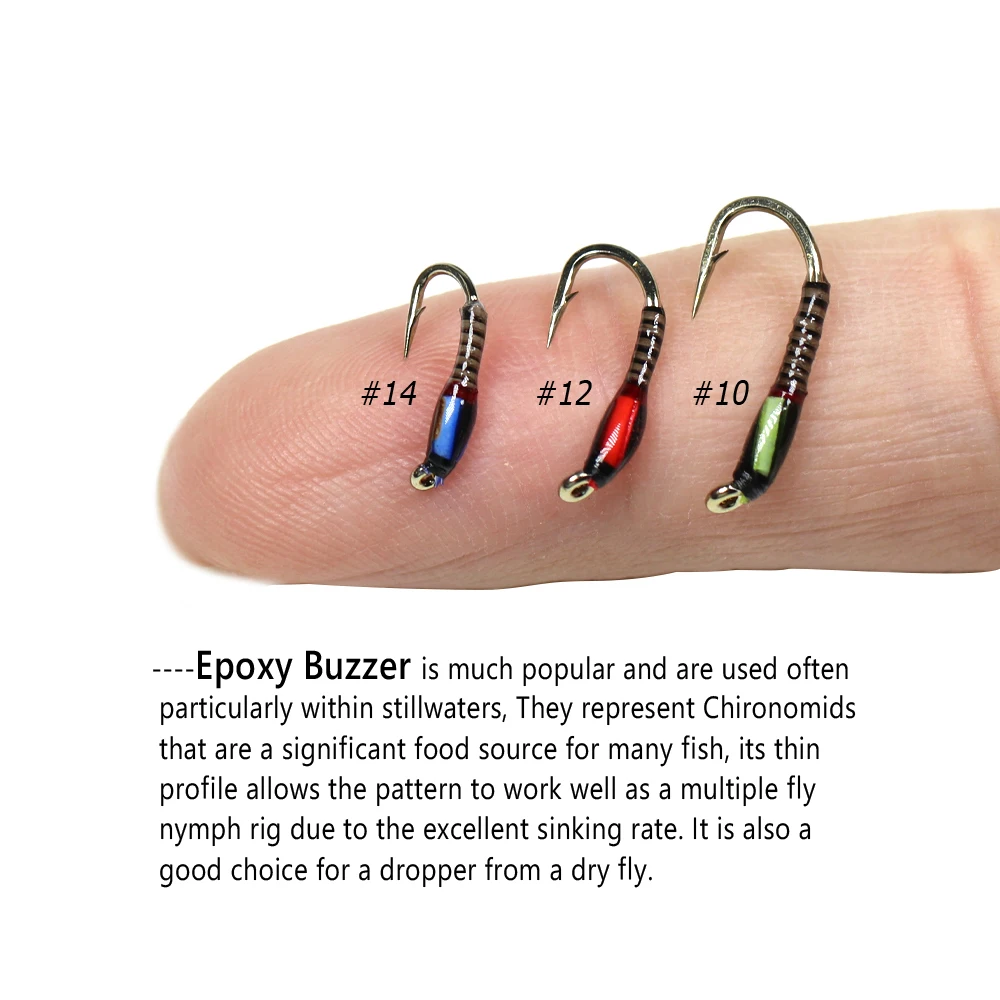----Los zumbadores de epoxi son muy populares y se utilizan a menudo, especialmente en aguas quietas. Representan Chironomides que son una fuente alimenticia importante para muchos peces, su perfil delgado permite que el patrón funcione bien como una plataforma de ninfas de mosca múltiple debido a la excelente tasa de hundimiento.También es una buena opción para un gotero de una mosca seca.